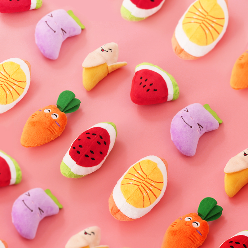 Dog toys --- semicircular watermelon dog toy --- orange pooch toy --- carrot dog toy --- eggplant dog toy --- (triangular watermelon) pooch