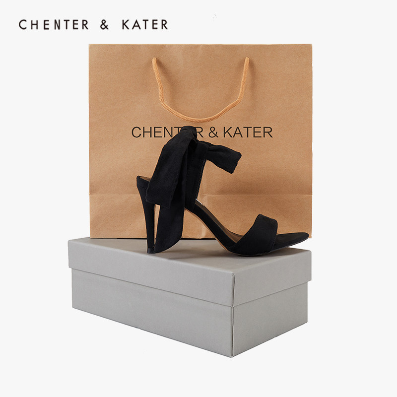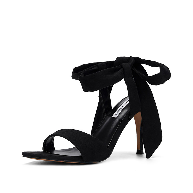 Little ck black stiletto heel women's shoes word with suede bow lace-up temperament celebrity with skirt high heels sandals