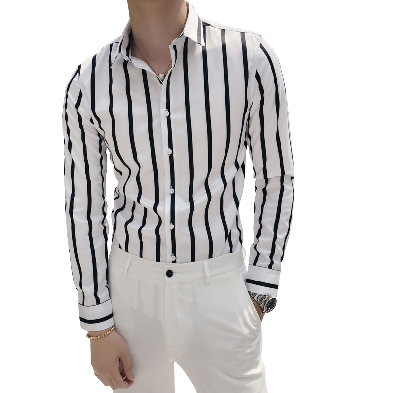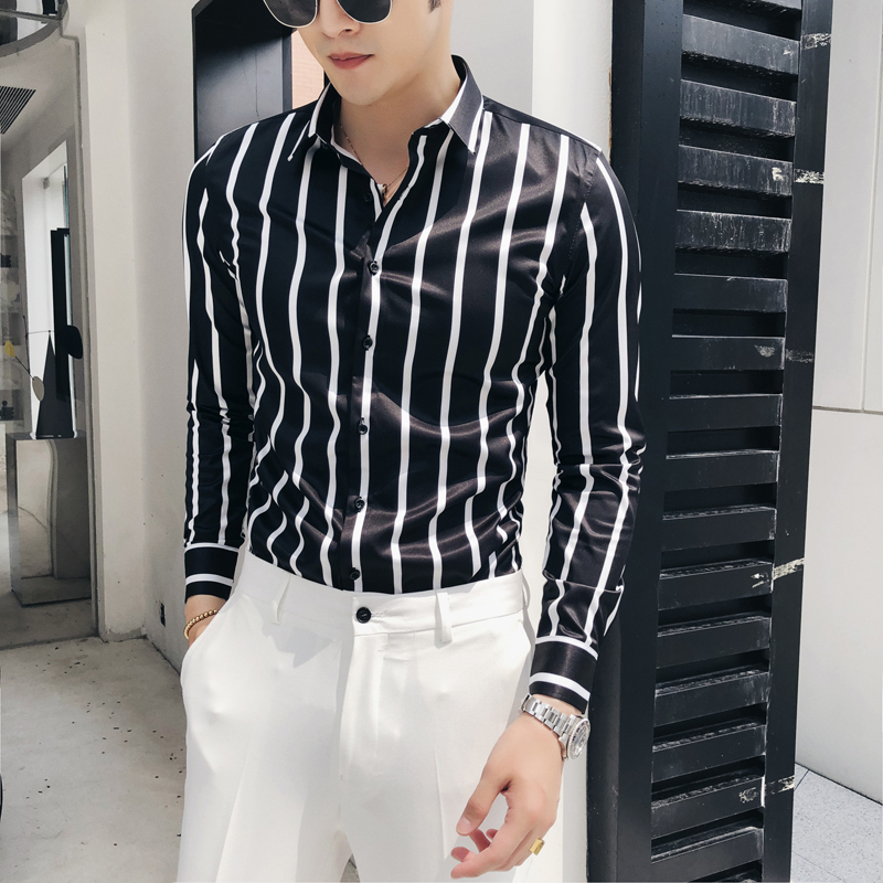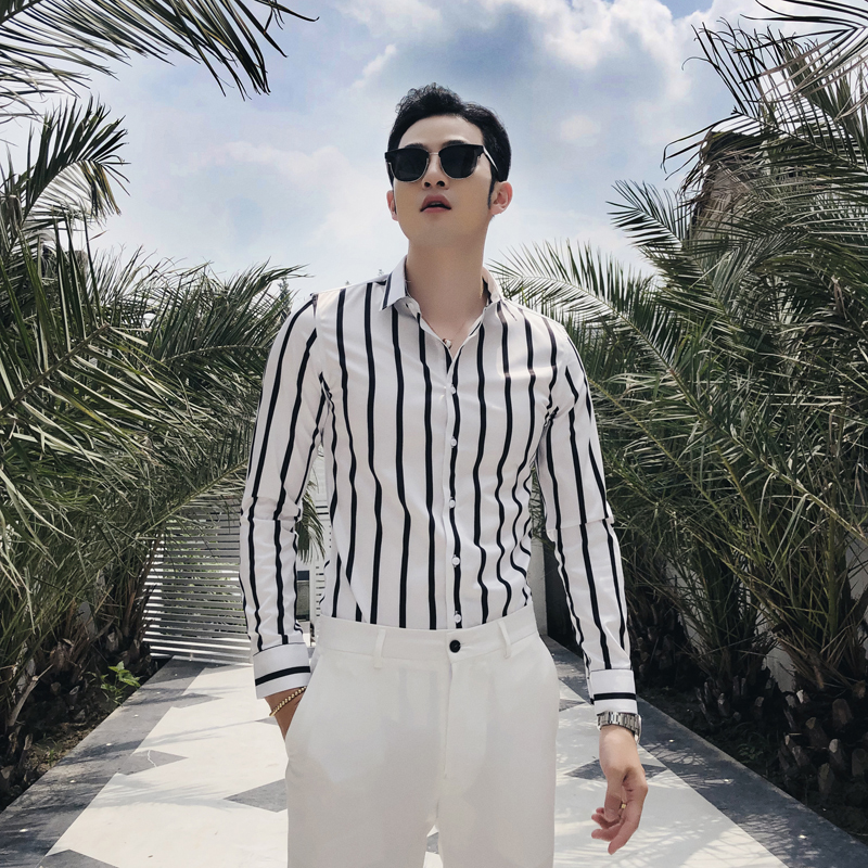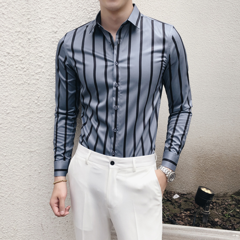 2020 new British striped shirt men's long-sleeved Korean version of the trend handsome slim-fitting hair stylist tide brand casual shirt
