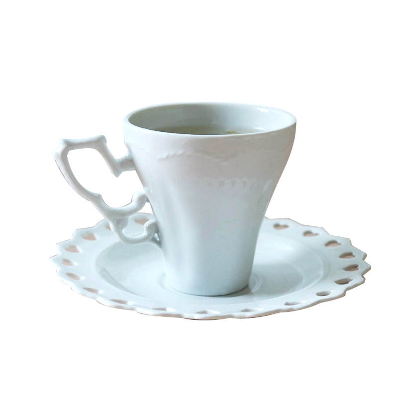 W1962 Outlet Europe Handcrafted Engraved Heart-shaped Hollowed-out Vintage High Feet Cold White Coffee Cup Saucer Vintage Tea Cup