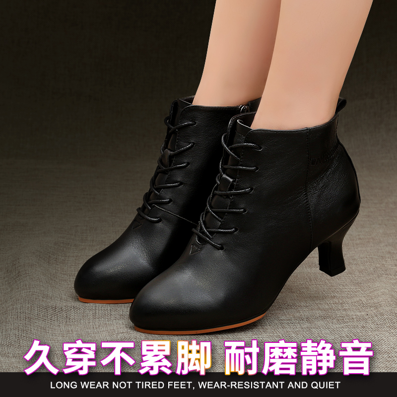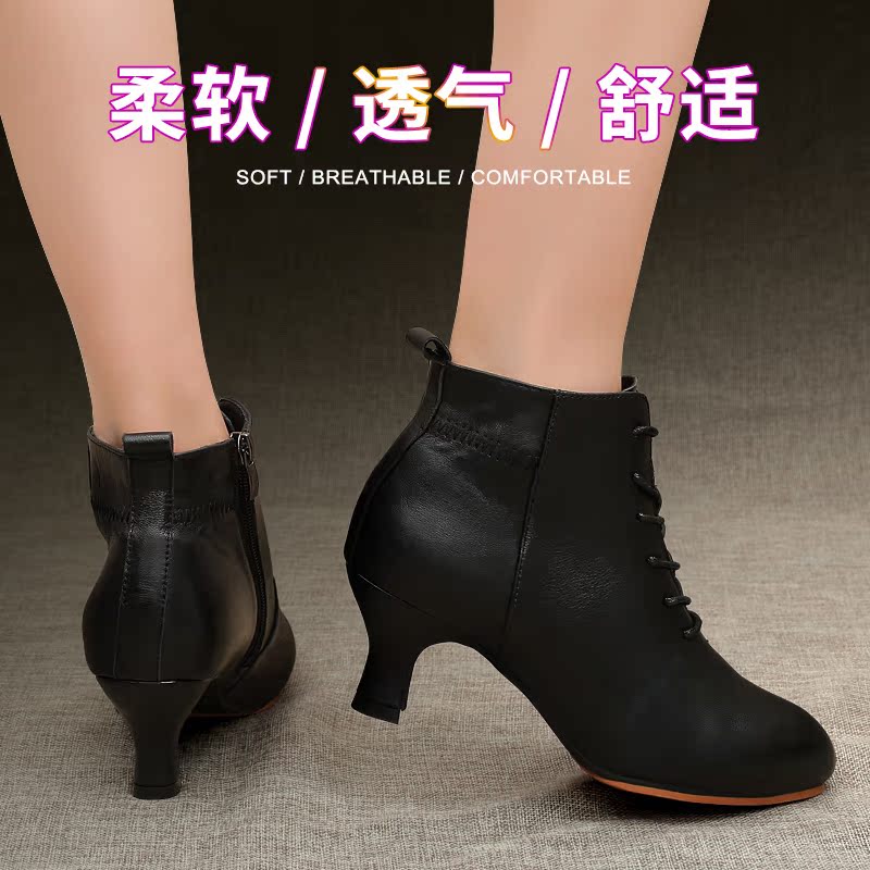 Jiao Baihui autumn and winter Latin dance shoes women's leather square dance shoes middle and high heels adult soft bottom social dance shoes boots