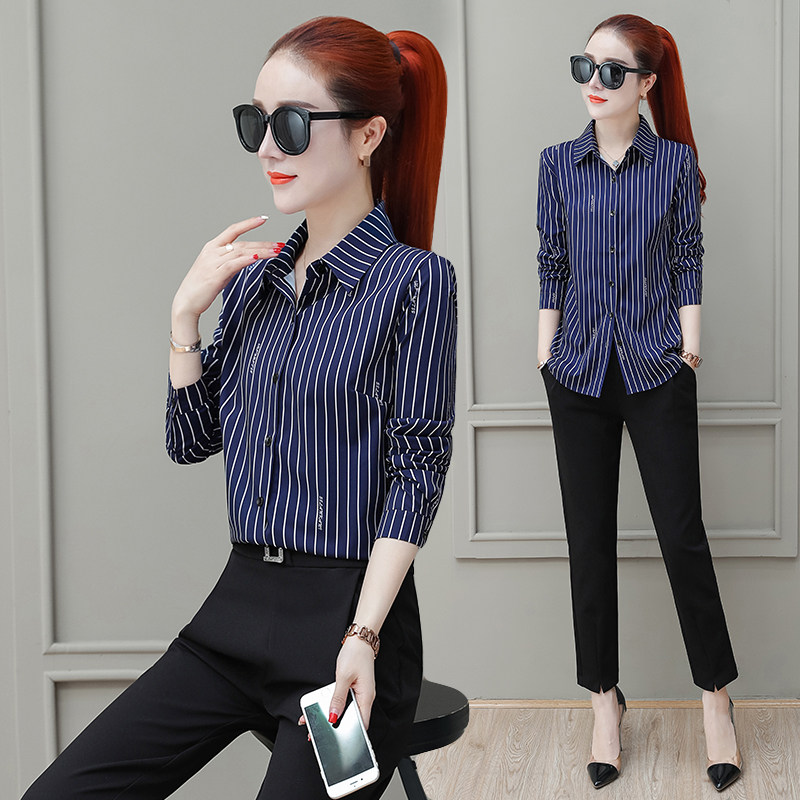 Shirt women's spring long-sleeved 2021 spring and autumn new Korean version of fashion wild middle and long version of vertical striped shirt spring and summer clothes