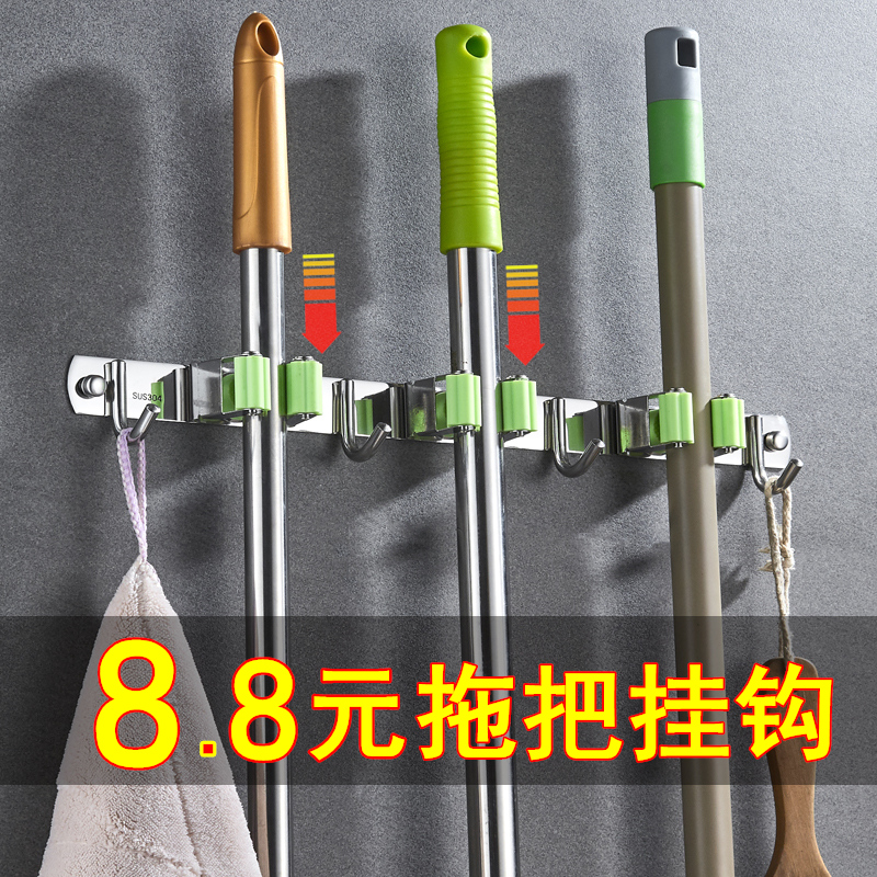 Mop hook free hole wall hanging powder room strong sticky hook Stainless steel clothes hook row clip Broom mop rack artifact