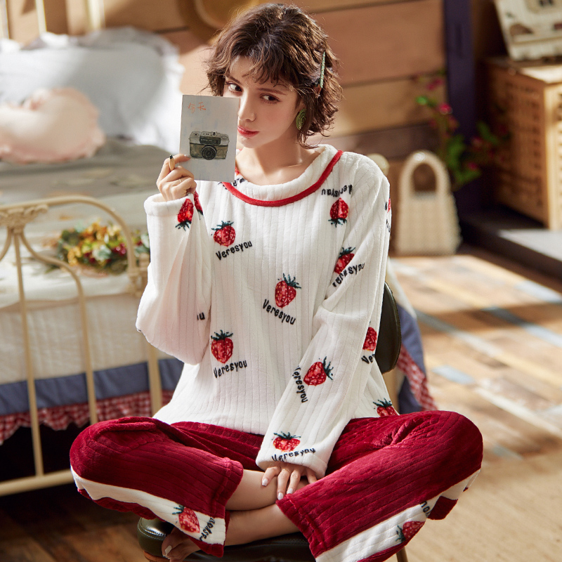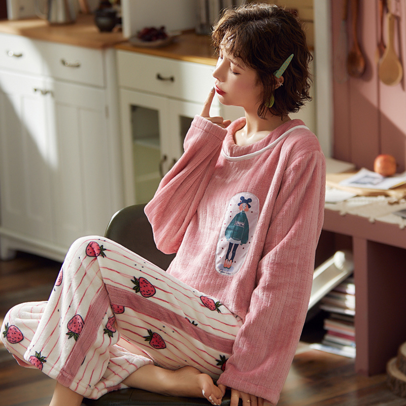 Coral velvet pajamas women's winter thickened warm cute women's flannel autumn and winter home clothes long sleeves can be worn outside