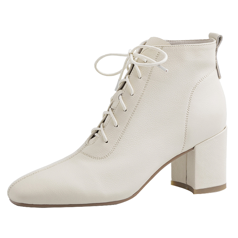 Small boots women's 2021 new autumn and winter leather plus velvet square head lace-up white thick-heeled boots high-heeled Martin boots