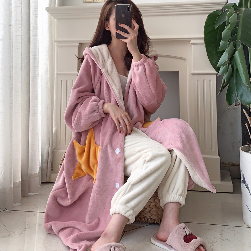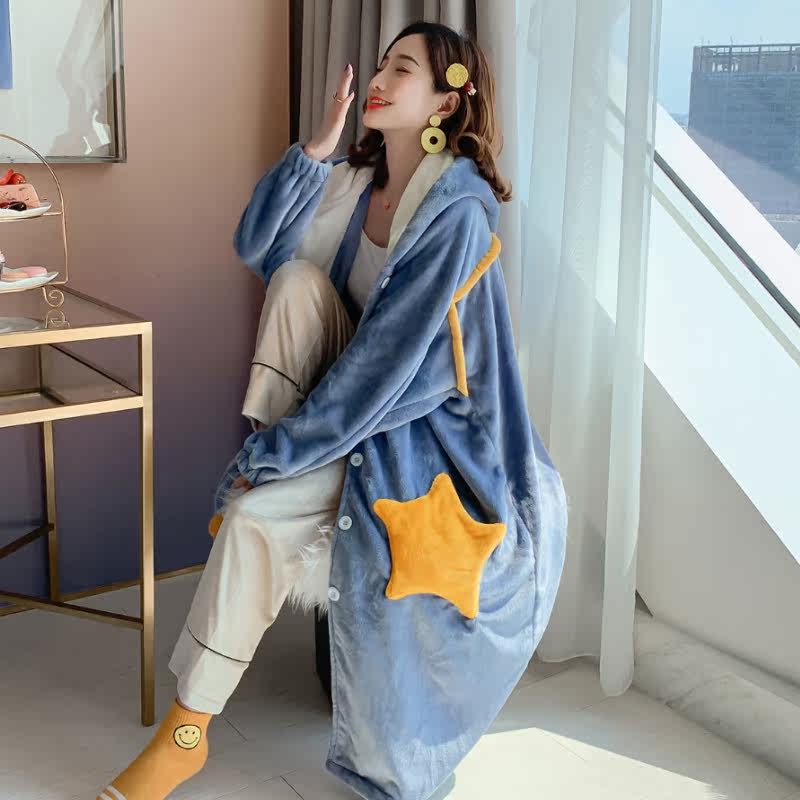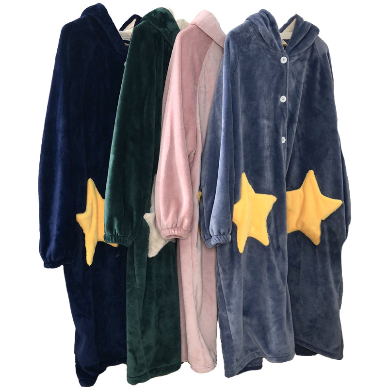 Nightgown women's spring, autumn and winter thickening, warm and cute plus velvet star loose plus size long version coral fleece pajamas winter
