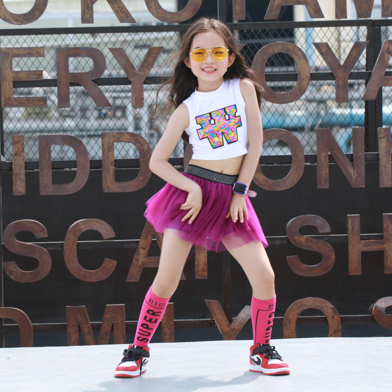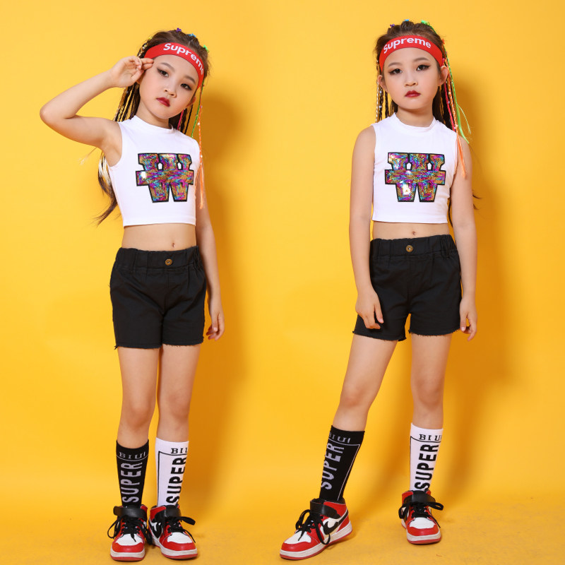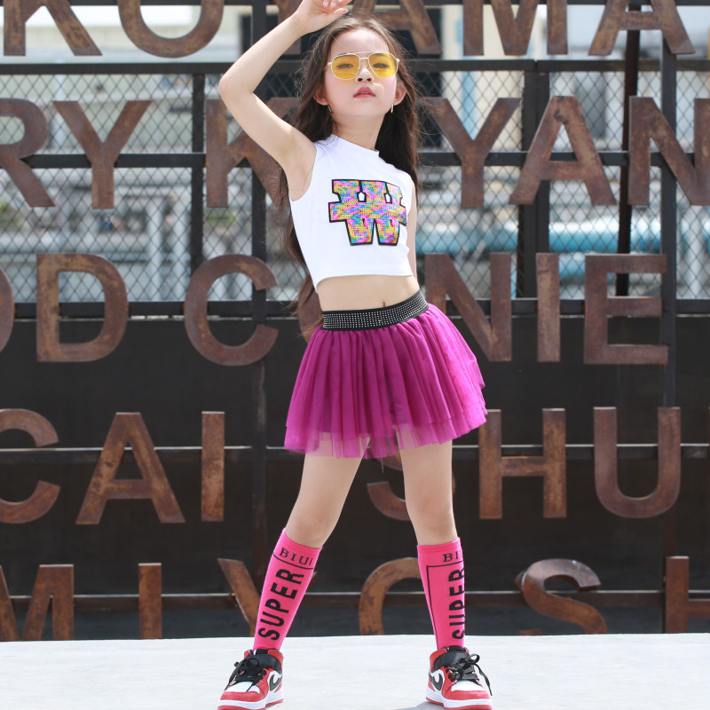 Children Jazz Dance Costumes Girls Kindergarten Fluffy Skirts Reveal Navel Sequa Dance Suit Summer Cheerleaders