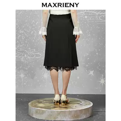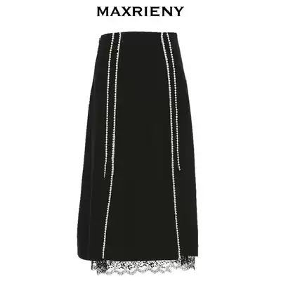 MAXRIENY new black nail bead A skirt women high waist lace edge Medium-length dress