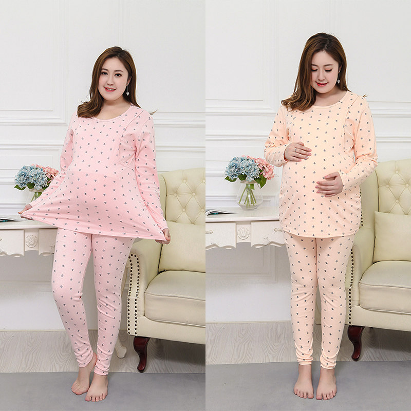 Large size pregnant women's autumn clothes and long johns suit pure cotton plus size female breastfeeding pajamas pregnancy postpartum breastfeeding confinement clothing