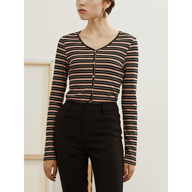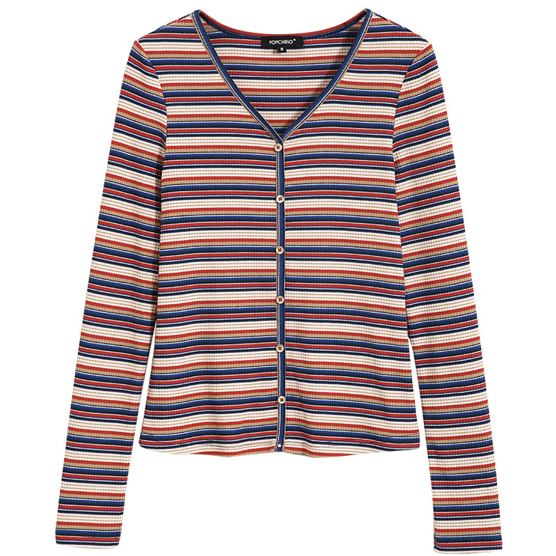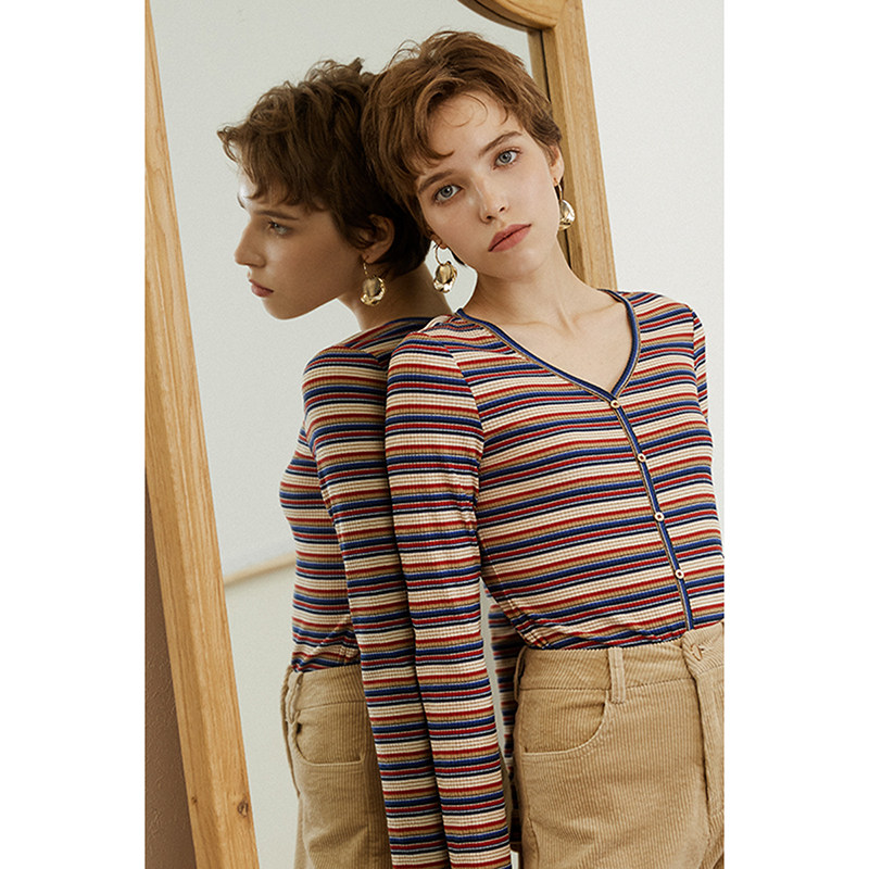 Okorui Mustang Rainbow Stripe ~ Vintage Long sleeve T-shirt V-neck Slim fit knitted base shirt for women early