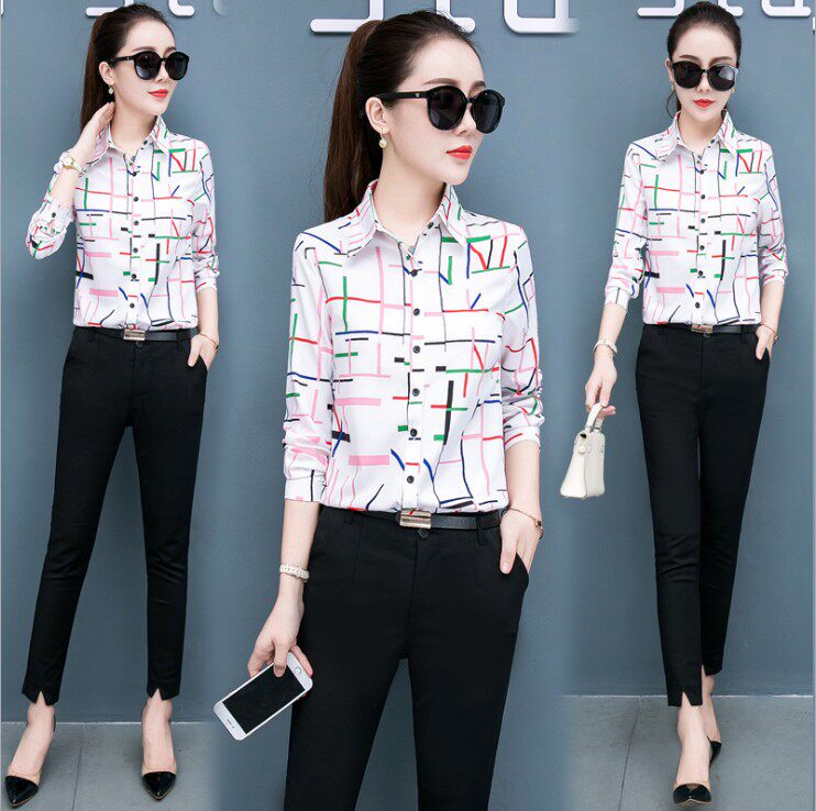 Office clothing autumn new white shirt women's long sleeve Korean version of plaid printed shirt slim size autumn bottoming shirt