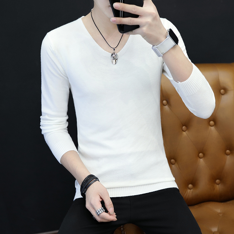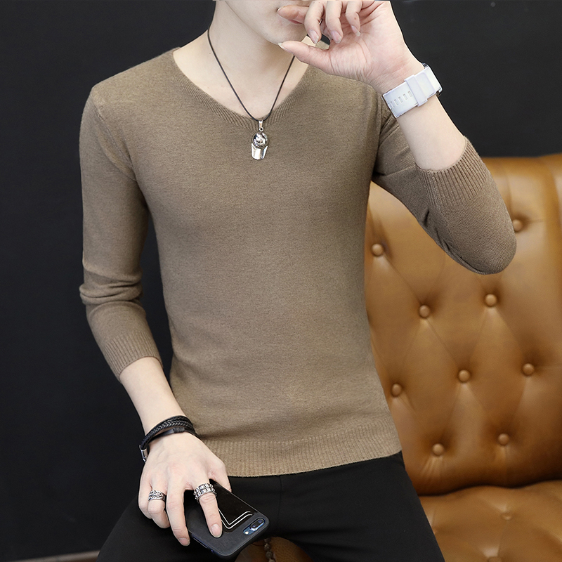 Long sleeve T-shirt men's V-collar knitted sweatshirt V collar Korean version Body Hair Stylist Pure color beating the bottom handsome clothes trend