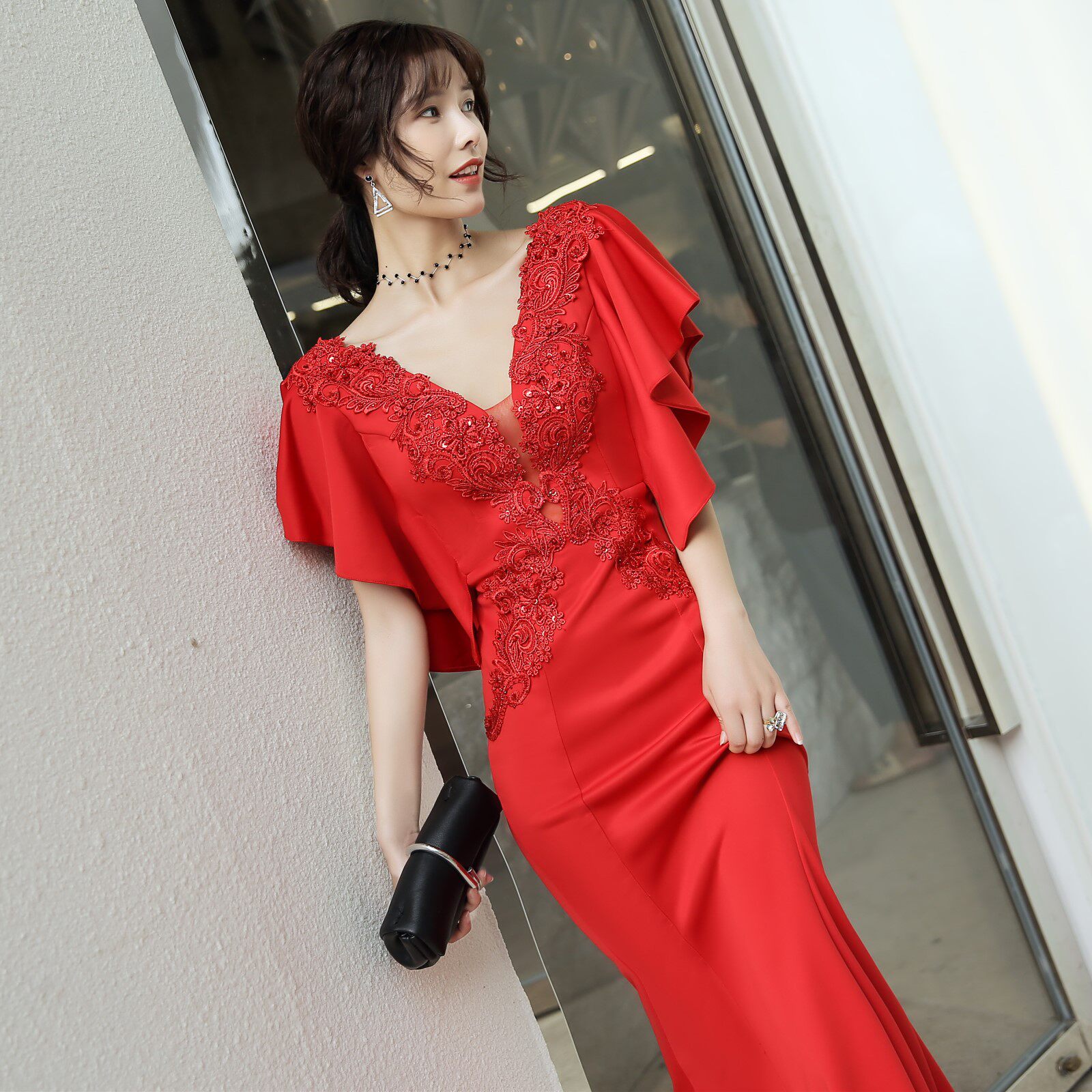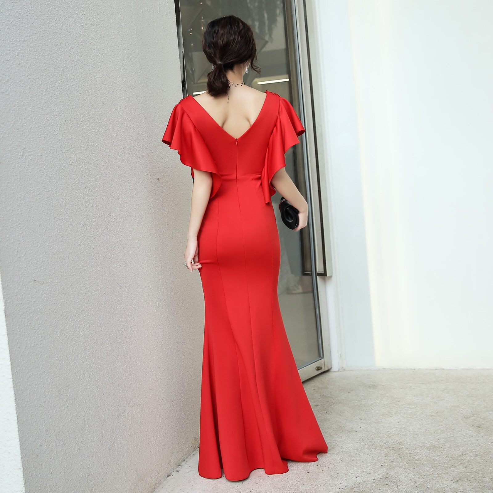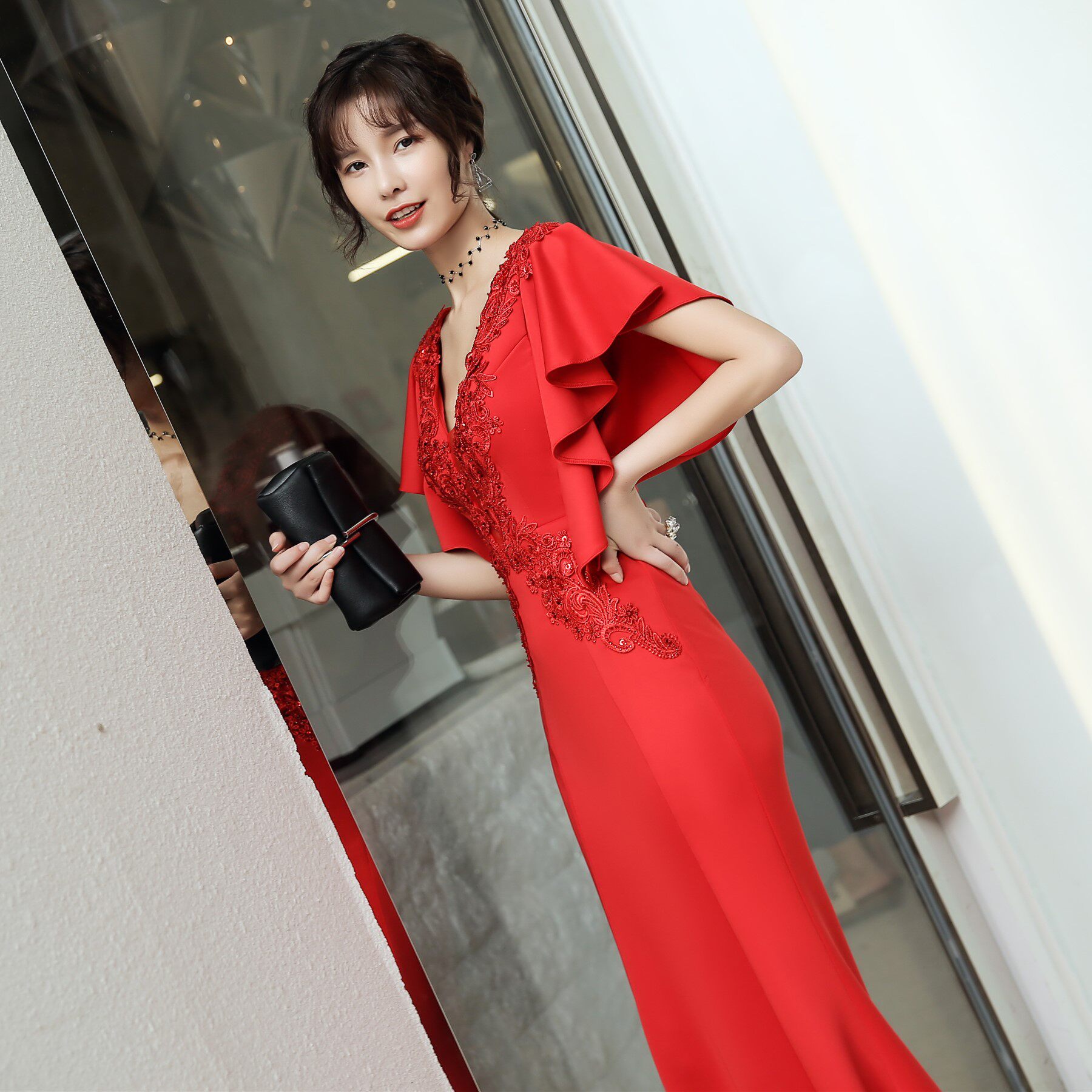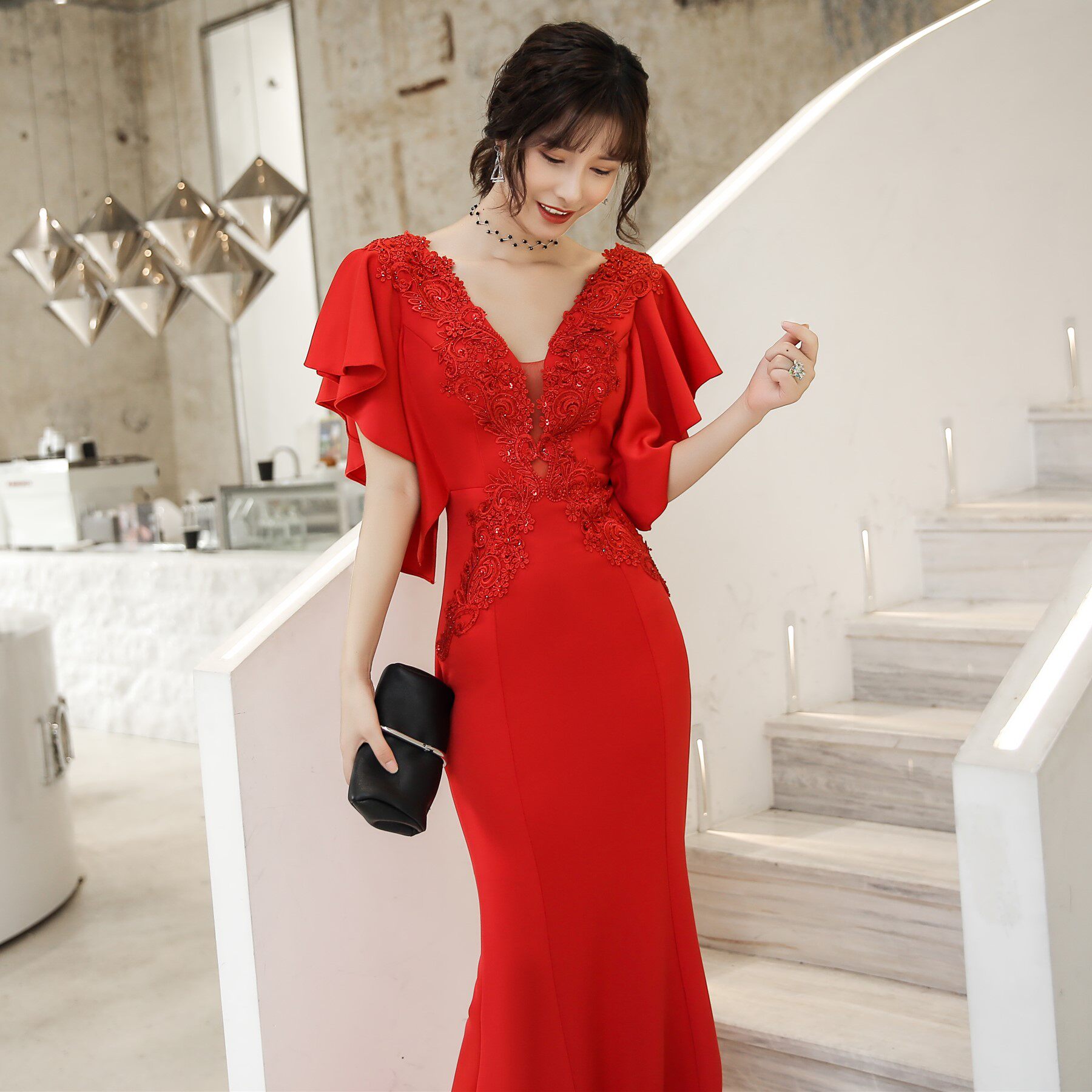 Elegant toast dress bride's long red deep V-neck flying sleeve thank you banquet slim mermaid skirt wedding evening dress female