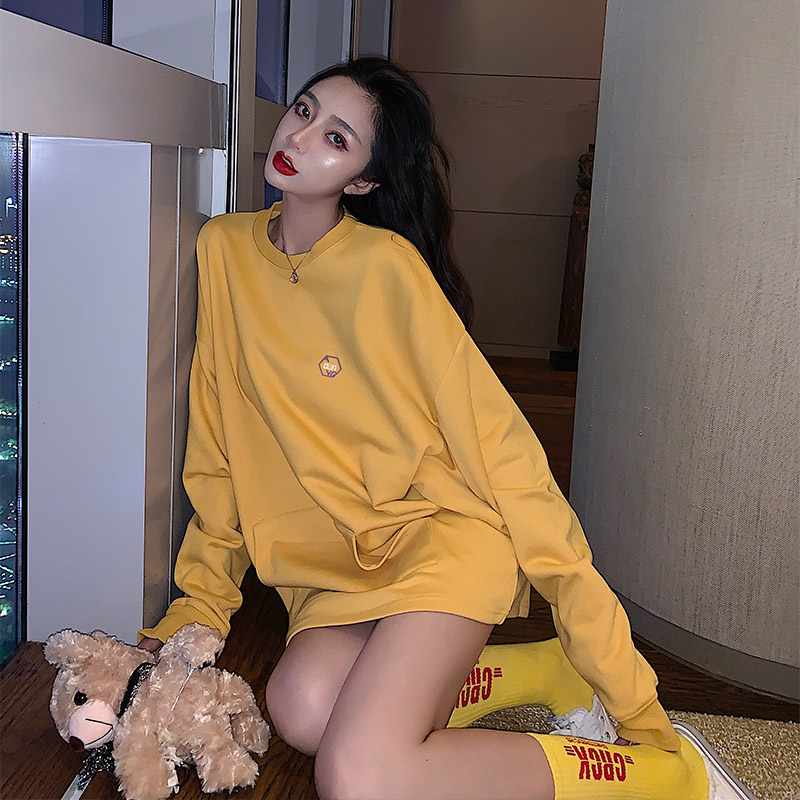 oversize set head sweatshirt woman 2022 new lazy wind long sleeve loose with long 100 100 hitch yellow blouses-Taobao