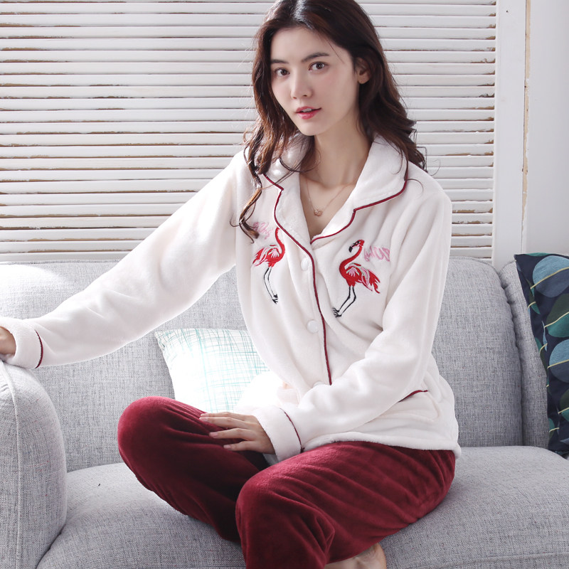 Pajamas Woman Autumn Winter Coral Suede Suit Thicken Plus Suede Cardiovert Long Sleeve Warm Flannel Home Conserved Spring Autumn-Taobao