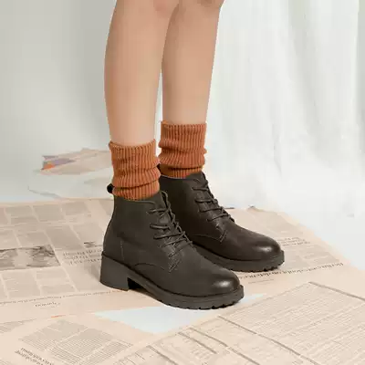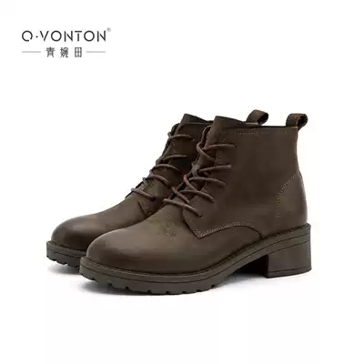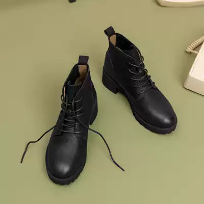 Qingwantian new leather locomotive Martin boots female English wind Joker thick-bottomed retro mid-heel boots women autumn and winter