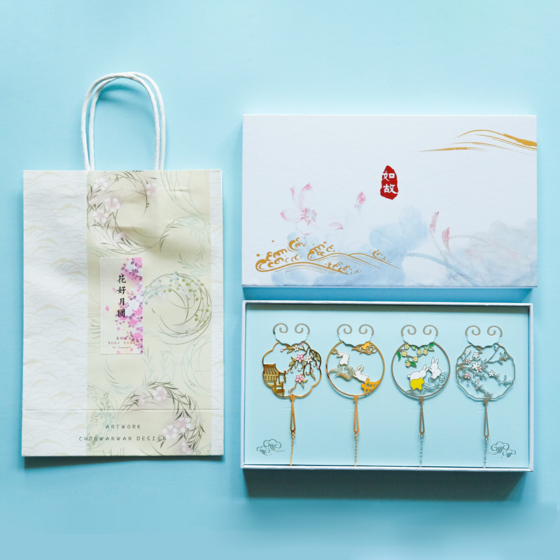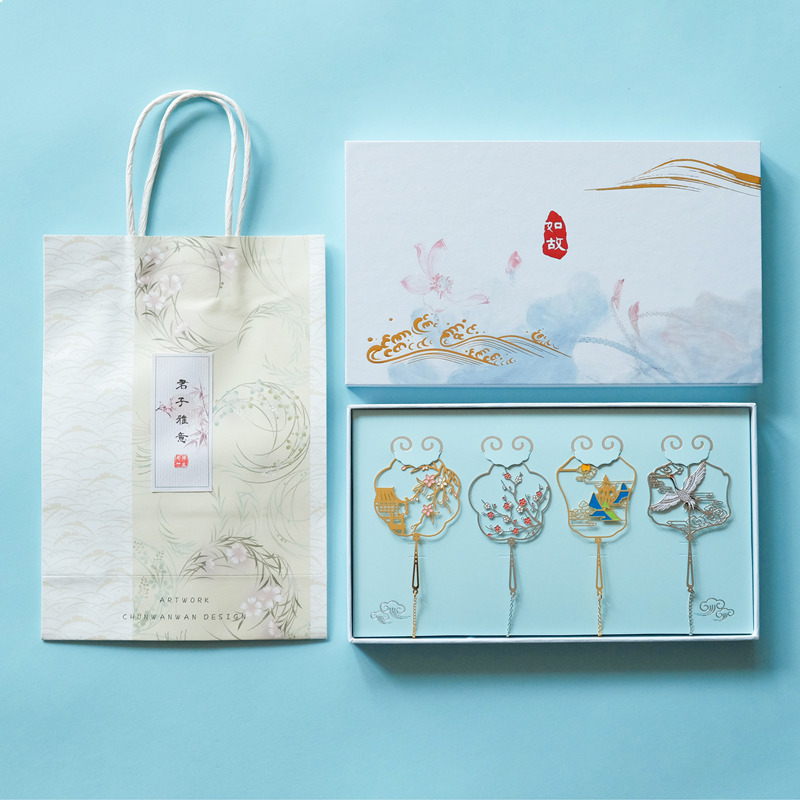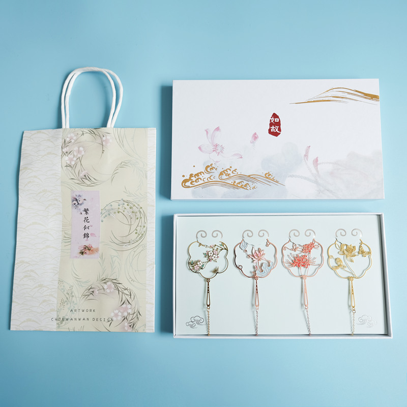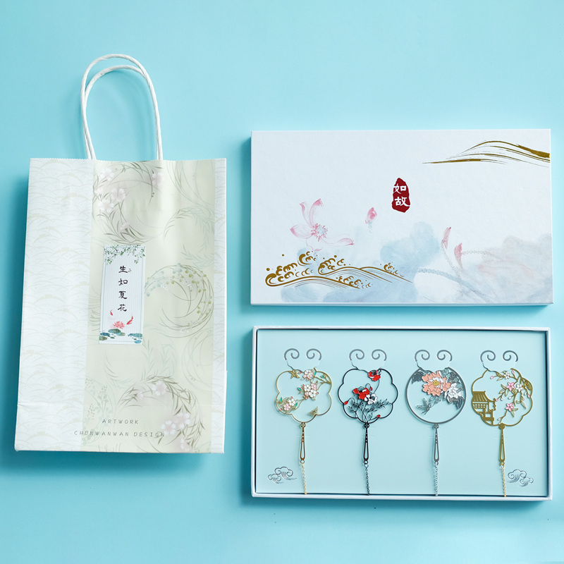 Metal Tuan Fan Bookmark Classical Chinese Style Literature and Art Small Fresh Annual Meeting Gifts Going Abroad to Send Foreigners Teachers' Day Birthday Gifts to Girlfriends Spring Day Evening Original Design (4 Gift Box Set)