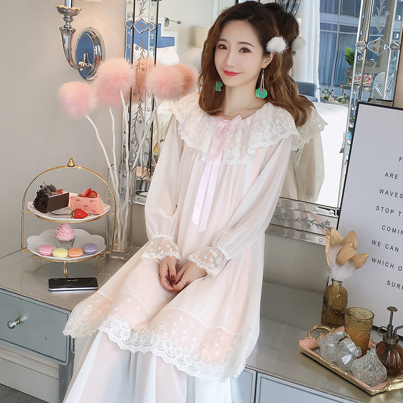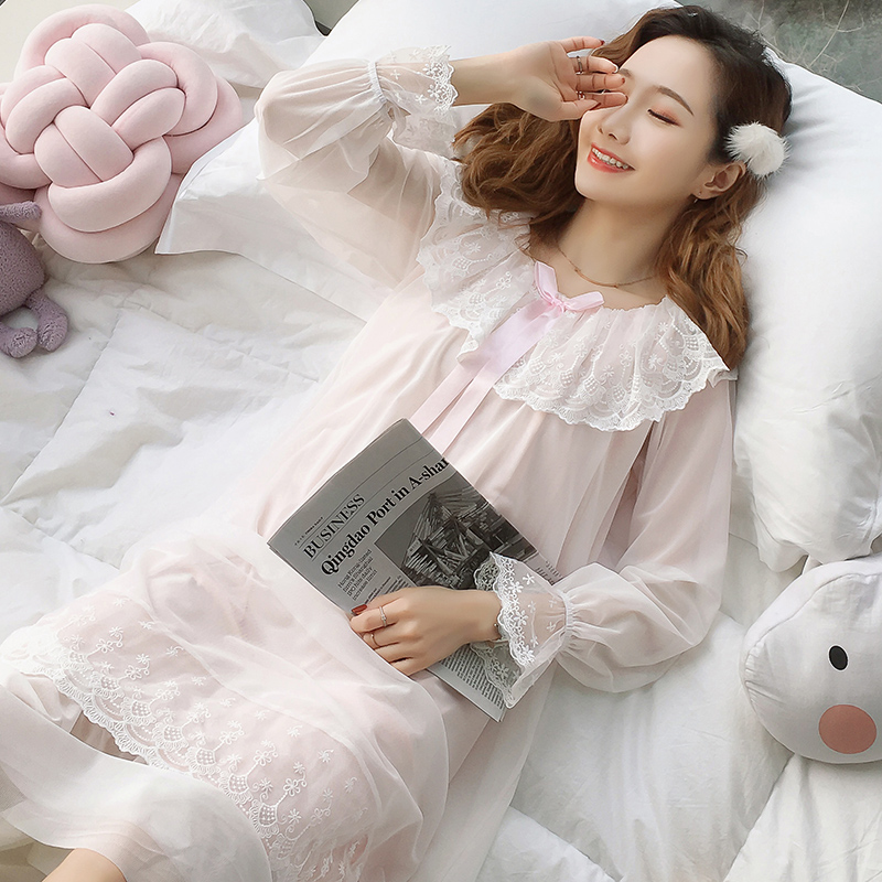 Net Yarn Sleeping Dress Woman Spring Autumn Season Long Sleeve Pure Cotton Palace Princess Wind Pyjamas Korean version Grace Winter Wonder Woman's Family Guy