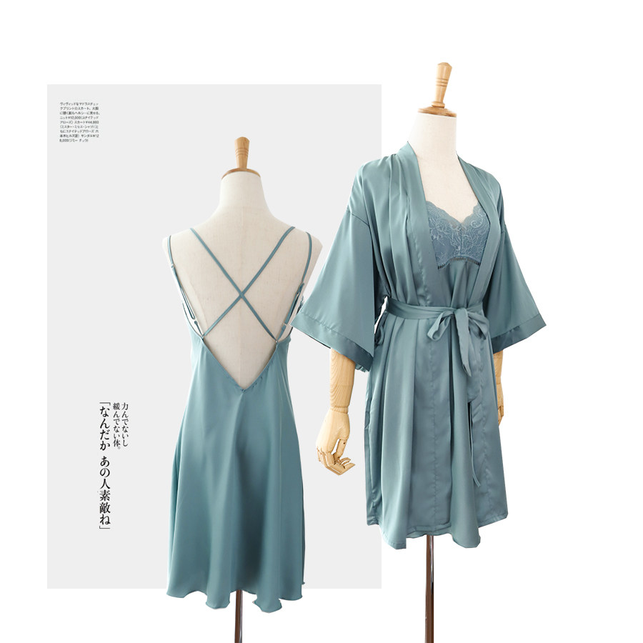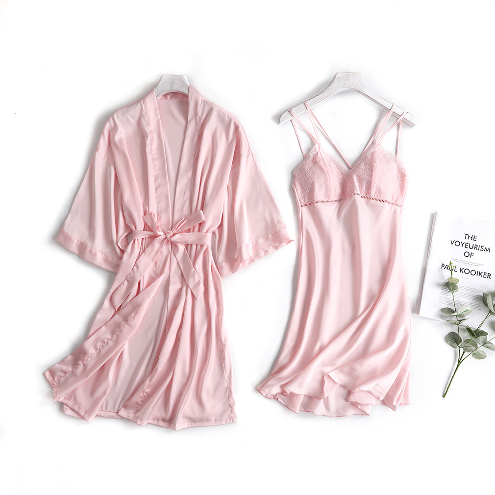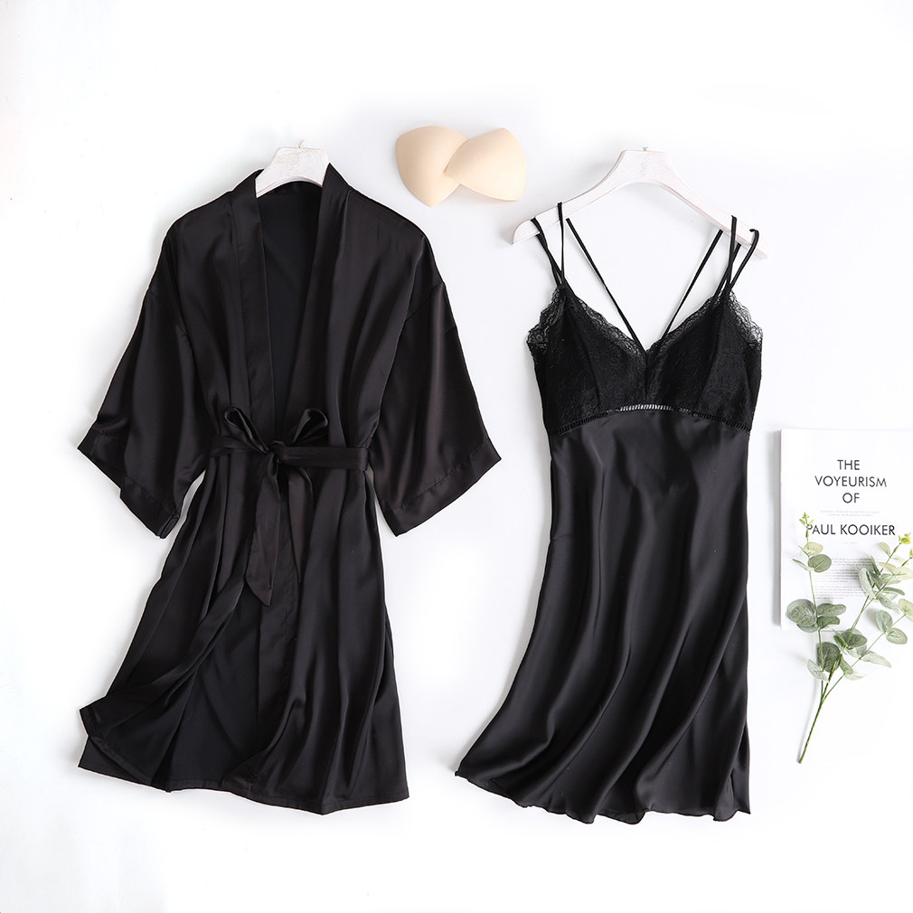 Sleepwear Ice Silk Sexy Female Real Silk Two Sets With Chest Cushion Harness Sleeping Dress Long Version Silk Fall Sleeping Robe Home