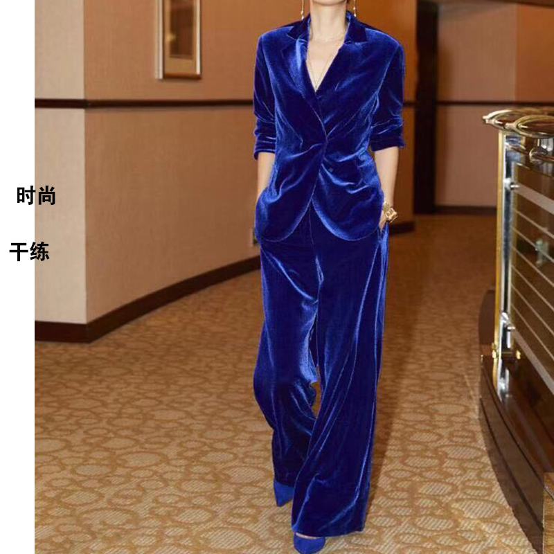 Ma Yili Luo Zijun same style suit jacket slim gold velvet blue small fragrant suit wide leg pants fashion suit
