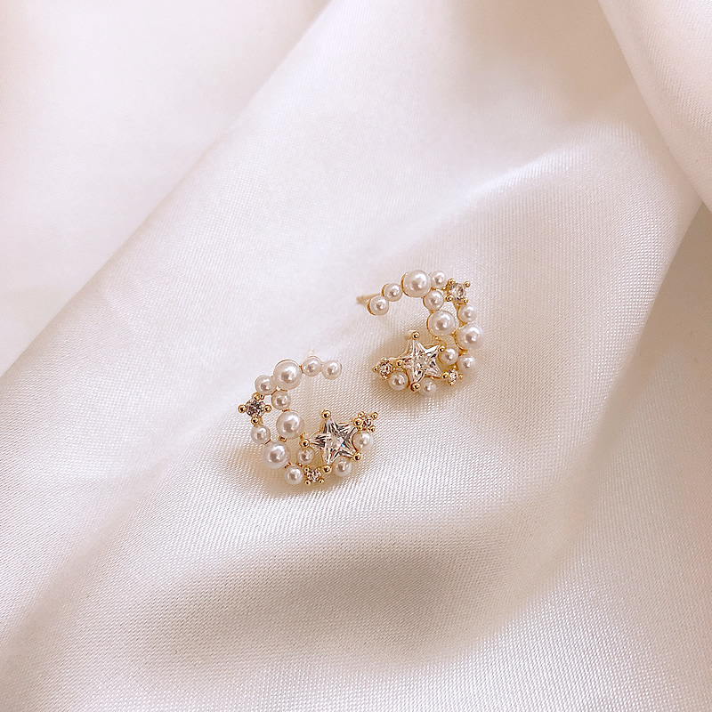 Stars Moon Earrings Female Brief About Small Pearl Earrings 925 Pure Silver Earshot Pins Nets Red Temperament Small Crowdwear
