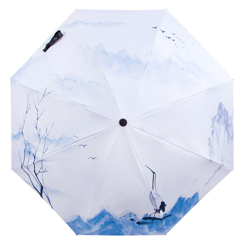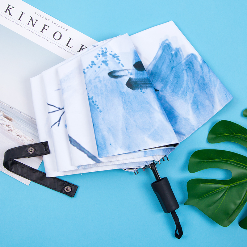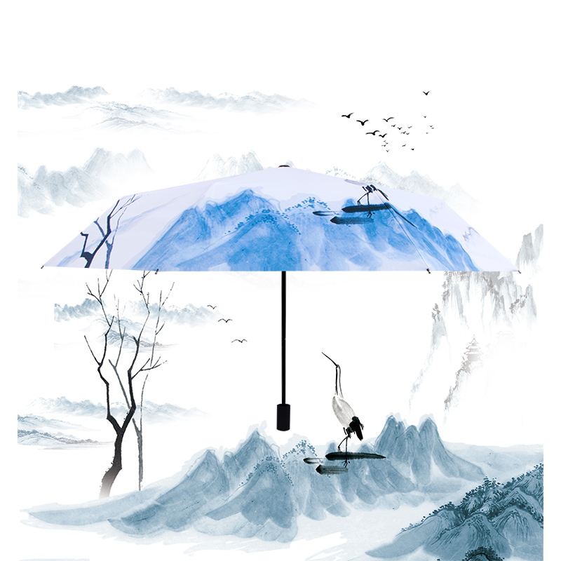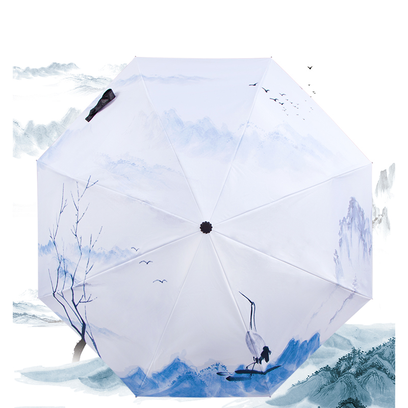 China Wind and art ink painting Xianghe 10 bone clear umbrella dual-use double black rubber female triple-folded sunshade sunscreen