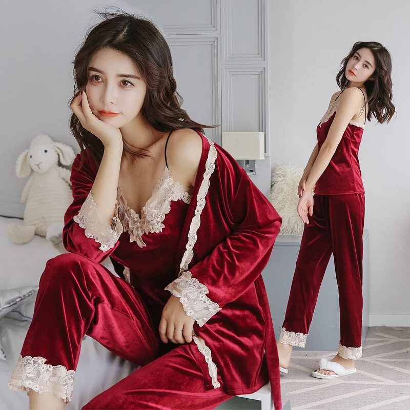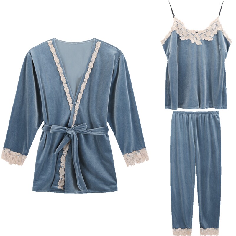 Autumn Winter New Harness Sleepwear Day Goose Down Sexy Sleepwear Woman Pyjamas Three Sets Gold Velvet Sleepwear Long Sleeve Suit
