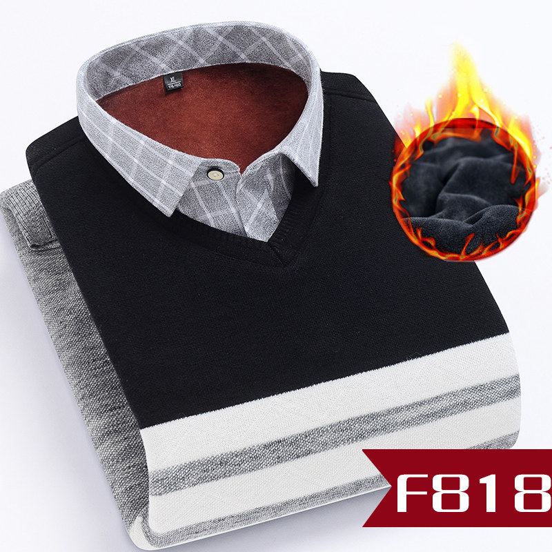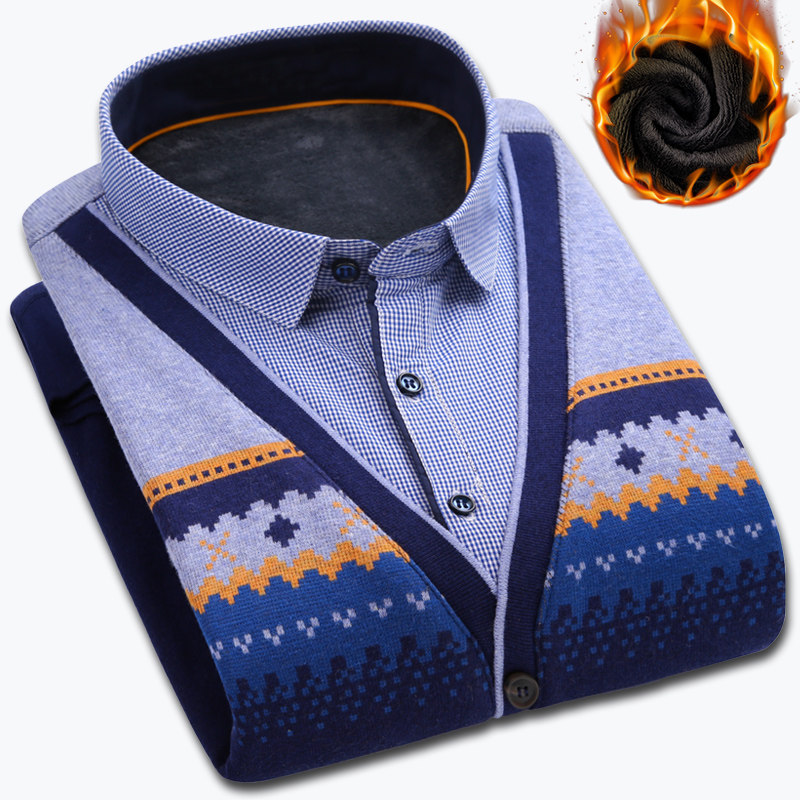 Winter men's fake two-piece heating coat Velvet thickened men's casual T-shirt Shirt collar sweater overcoat