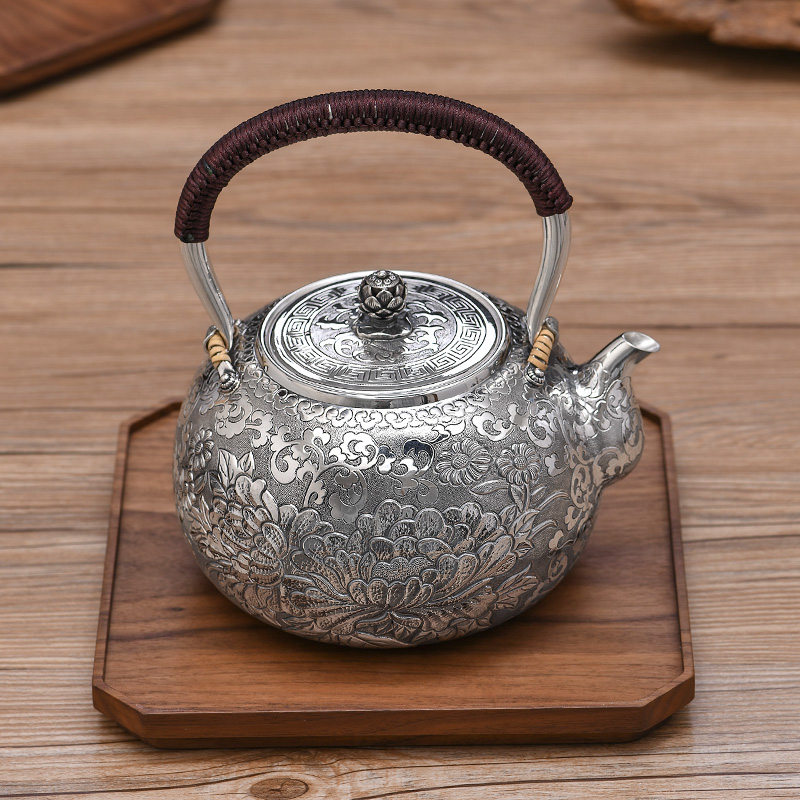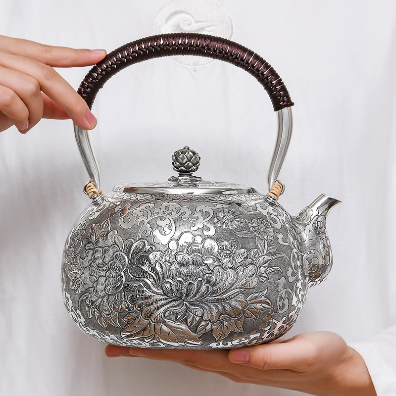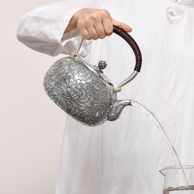 Guiyintang silver kettle Sterling silver 999 kettle Handmade deep relief peony teapot Household large capacity Kung Fu tea pot