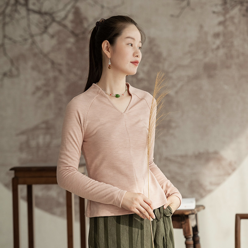 Moshang Huakai Original Orchid Lapel (Time Knows Taste) Cotton Knit Top Female V-Neck Slim Bottoming Shirt Thank You