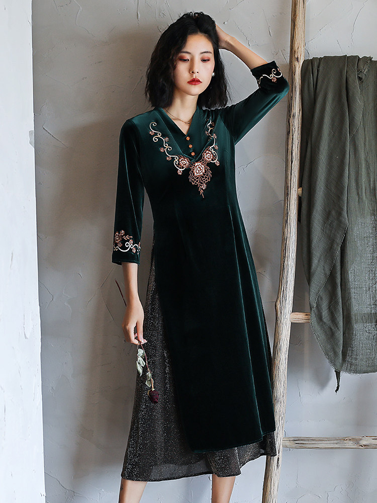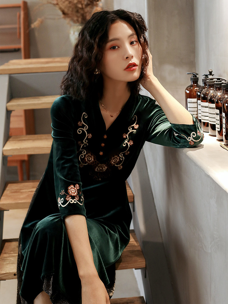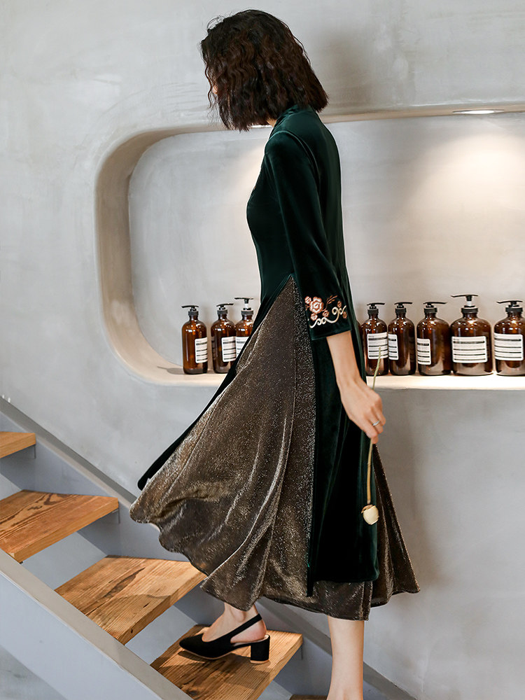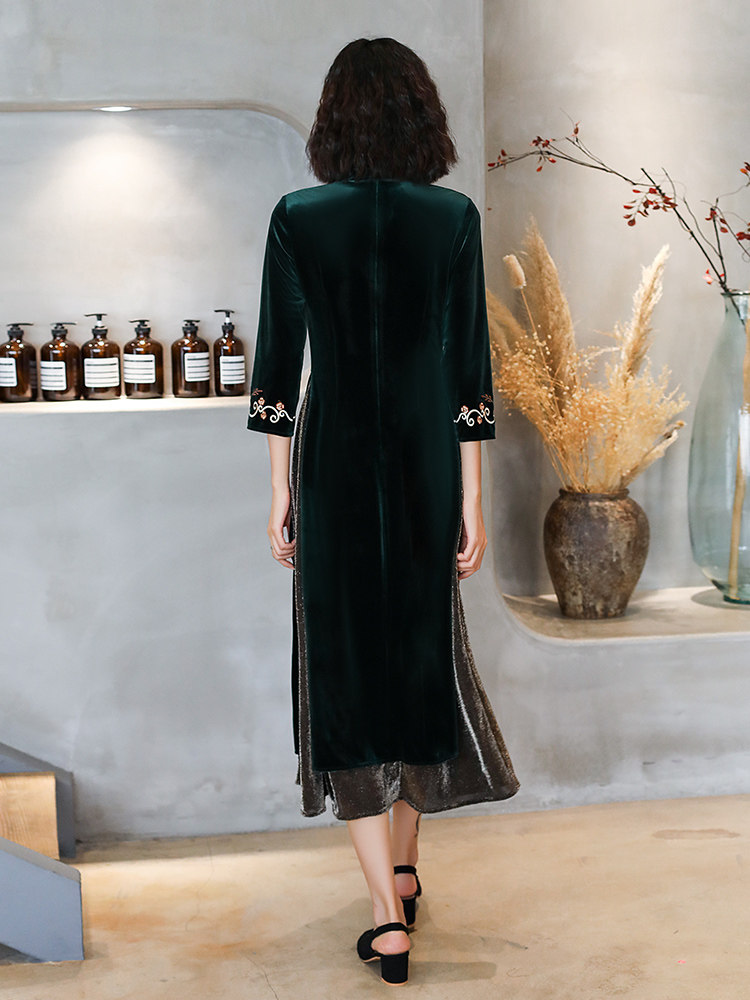 Dark green mother's autumn and winter gold velvet dress Noble foreign school retro slim-fit large size temperament medium and long version of the woman