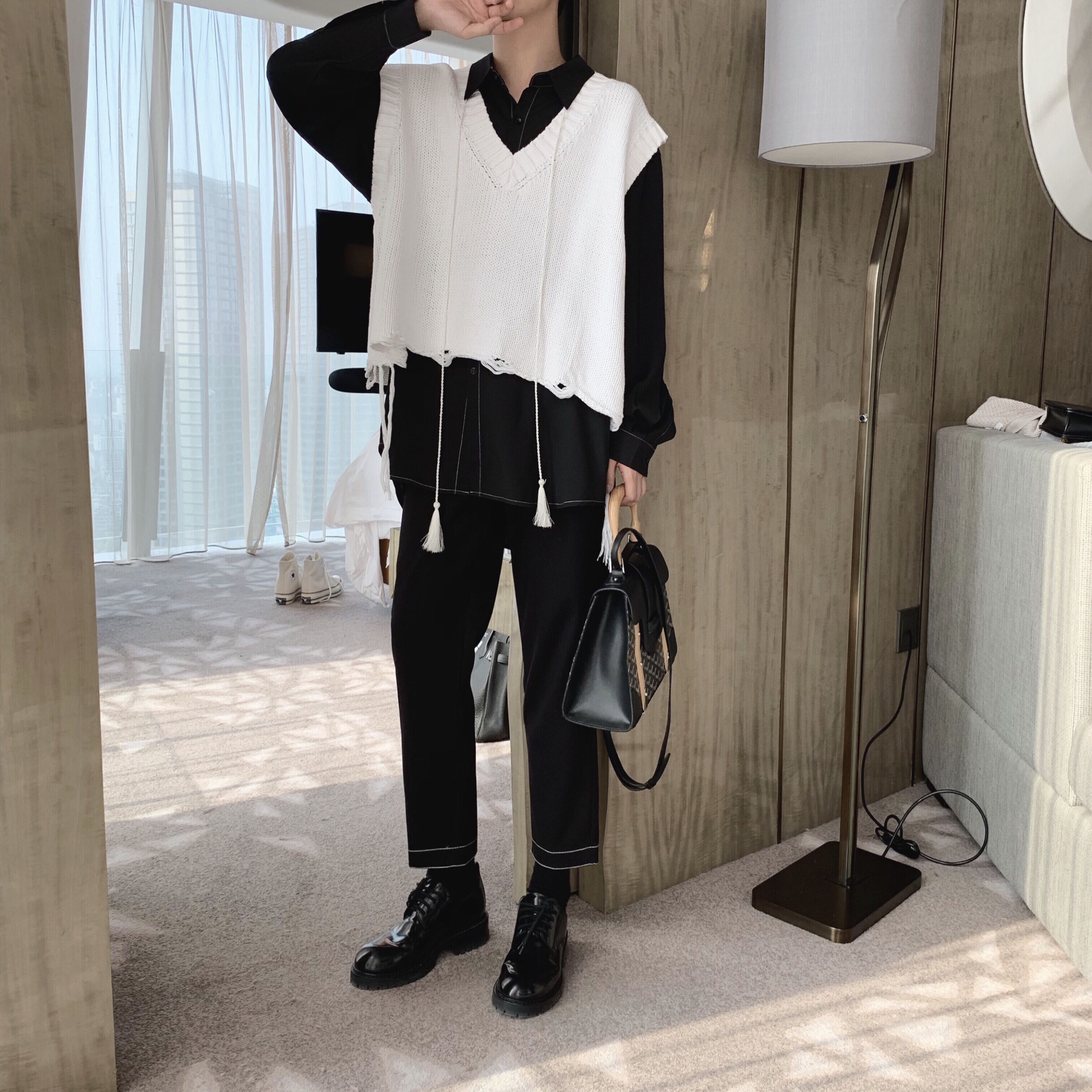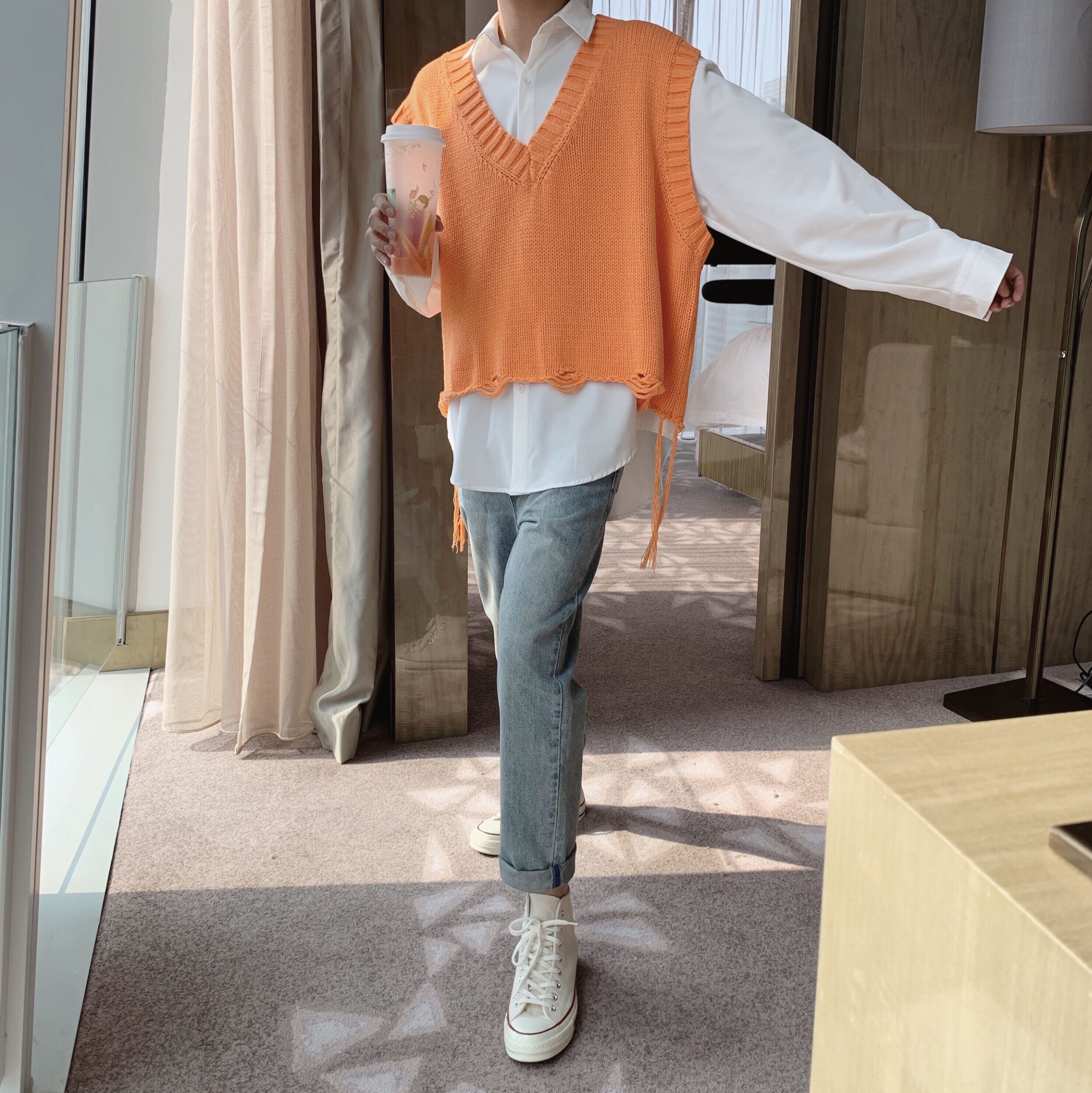 A tea and Agu autumn short section broken edge knitted vest men's Korean version temperament V-neck sleeveless sweater vest
