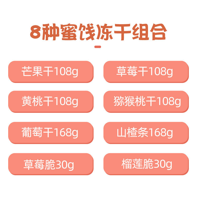 (5 models) Dried mango yellow peach dried kiwi raisin strawberry crisp (5 models) dried mango yellow peach dried kiwi hawthorn strawberry crisp (5 models) dried mango strawberry dried yellow peach dried kiwi hawthorn strip (5 models) strawberry dried strawberry crisp raisin kiwi hawthorn strip (5 models) yellow peach dried mango dried raisin kiwi hawthorn strip (8 models) candied fruit dried combination 828g free match 5 models (please contact customer service)