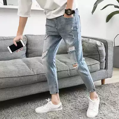 Pants men's ripped jeans light-colored slim-fit cigarette tube pants tide brand Korean version of youth personality elastic all-match nine-point pants