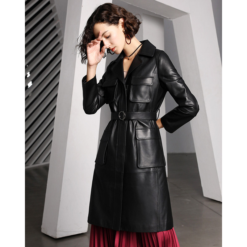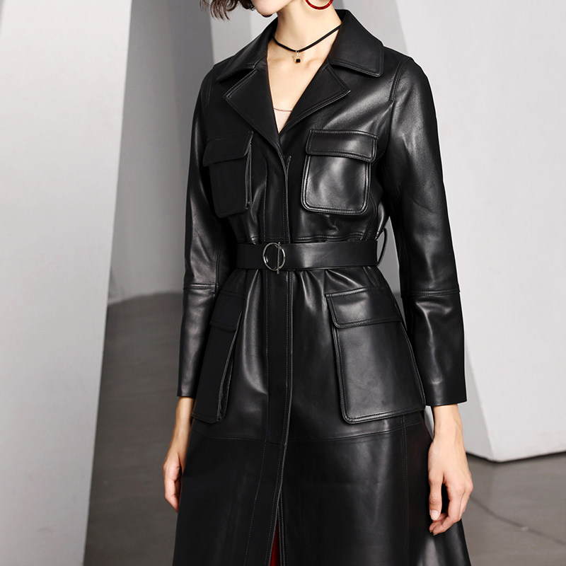 U N Q European and American Style Fashion Overwind collar collection waist display slim wind clothes in long version genuine leather fur coat female jacket woman