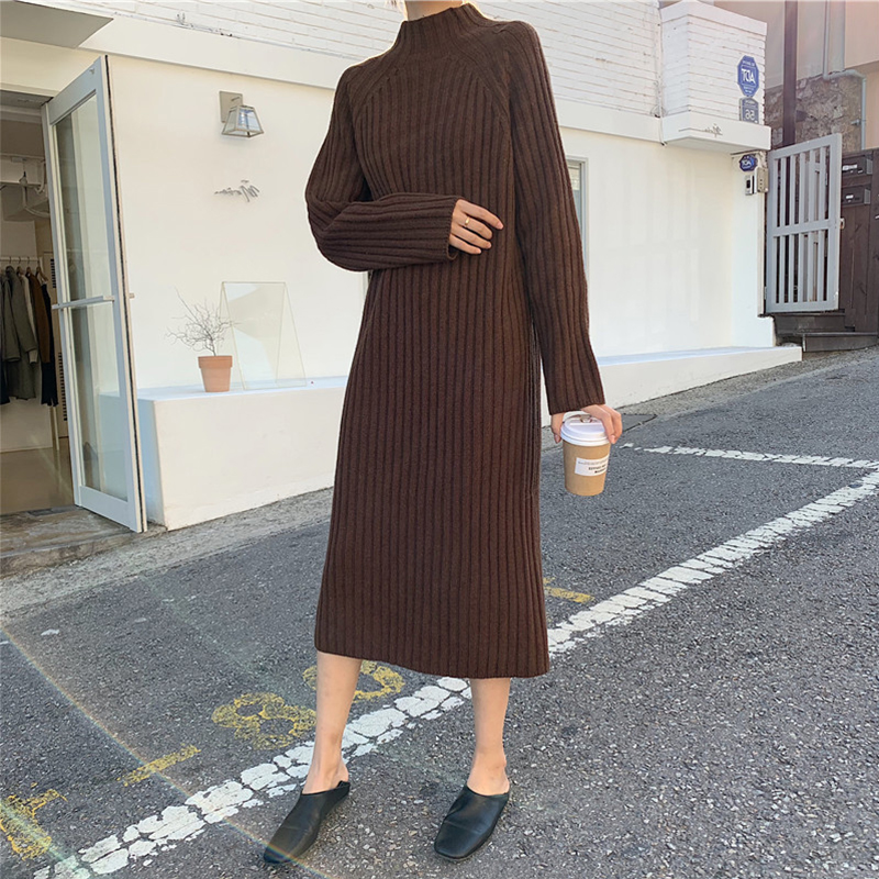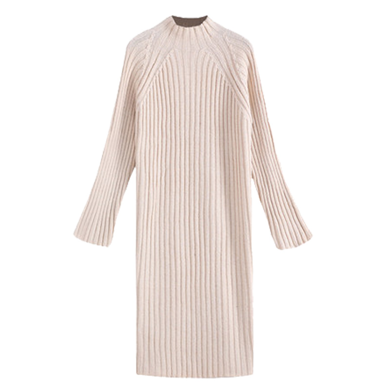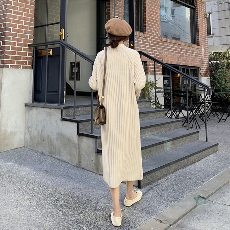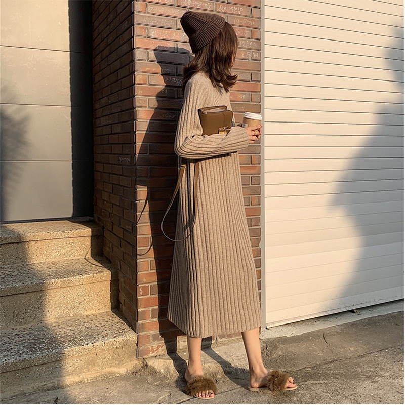 Autumn and winter long version thickened loose lazy wind sweater women's knee long skirt with knitted inside dress fake collar