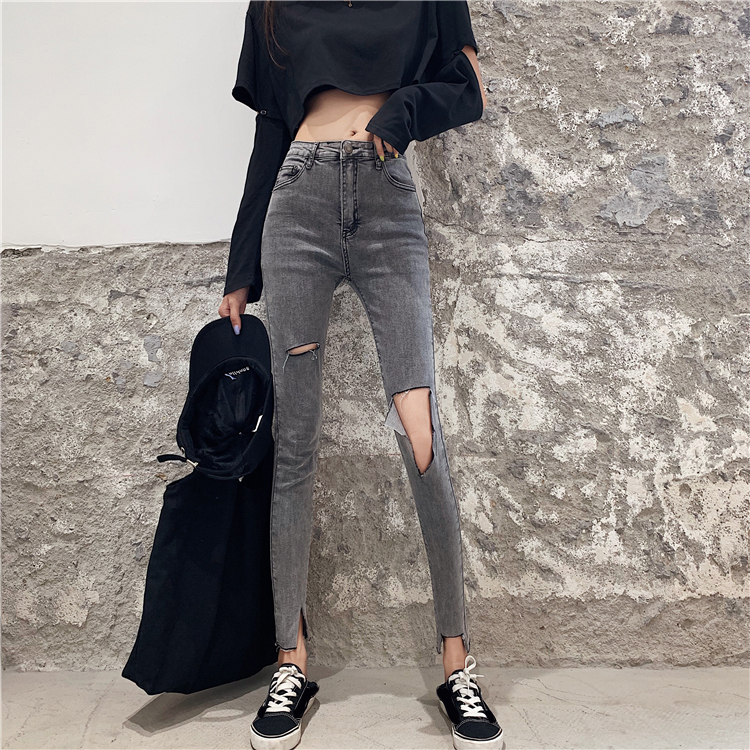 Breaking Hole Jeans Women's Summer New slim fit high waist open fork slim fit 100 lap smoke tube pants black tight fit long pants