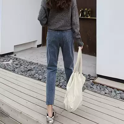 Ribbed jeans women's loose and thin 2020 autumn and winter new plus velvet wild pants elastic high waist daddy pants