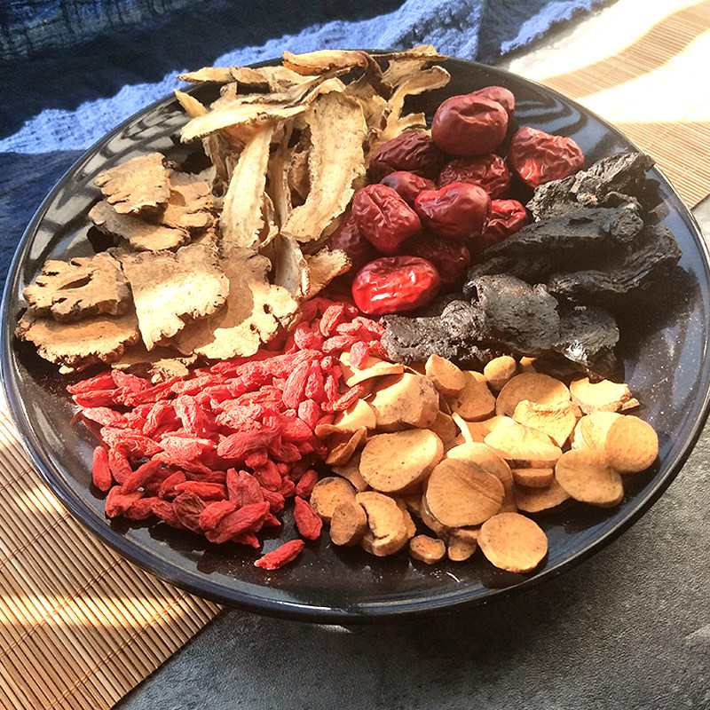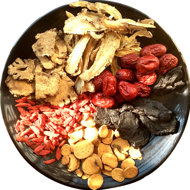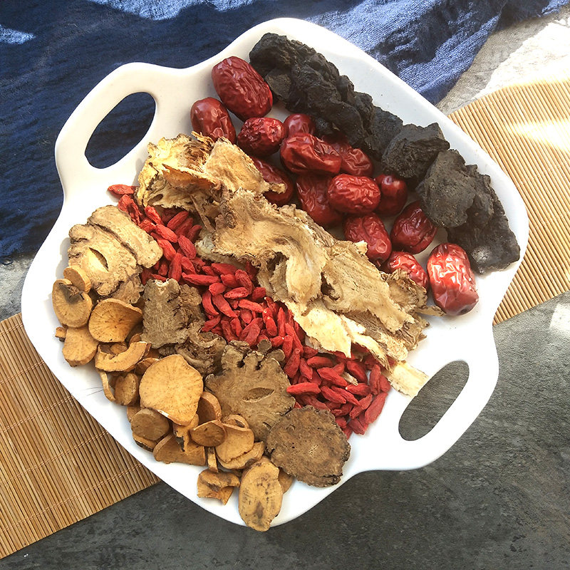 Angelica, Chuanxiong, Fried Paeoniae Alba, Red Dates, Lycium barbarum, Rehmannia glutinosa
