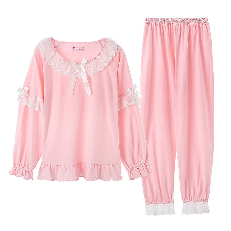 Pajamas women's spring and autumn cotton long-sleeved two-piece set Student Korean version sweet girl pink home dress set Autumn and winter