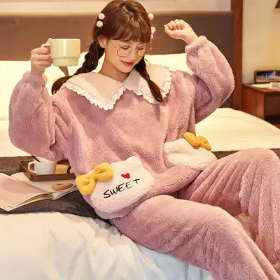 Pajamas female autumn and winter flannel plus velvet padded Korean hooded home clothes Lady coral velvet cartoon large size spring and autumn