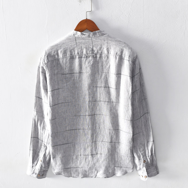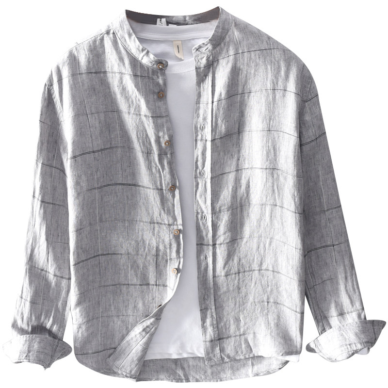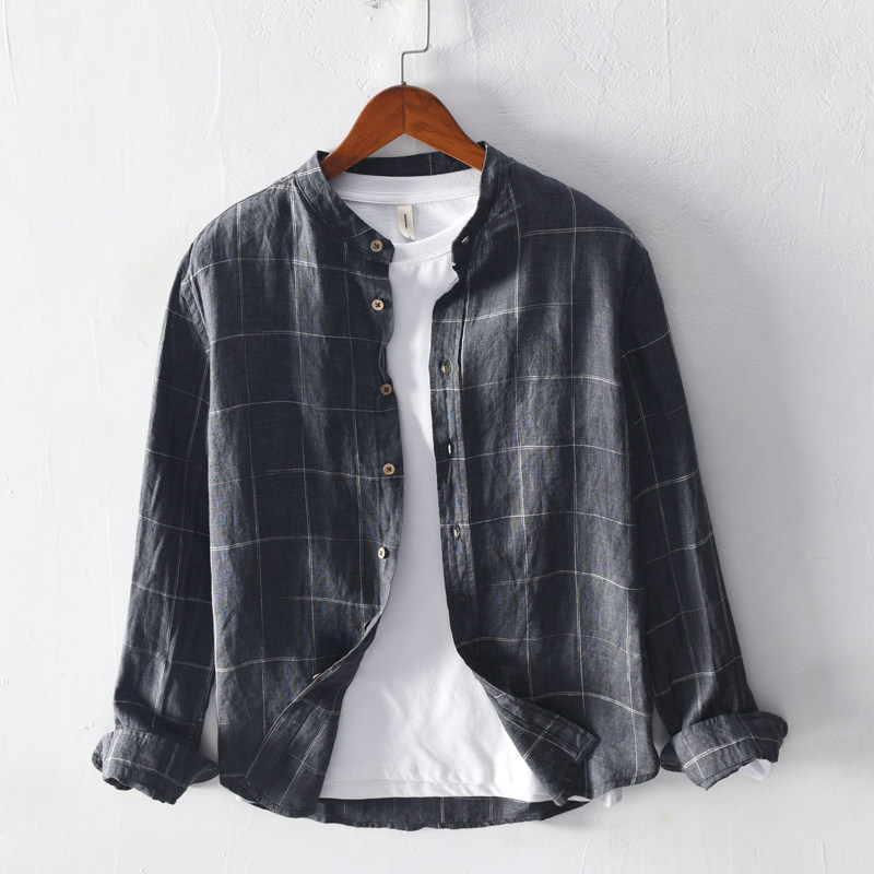 Extremely hemp retro plaid stand collar autumn long-sleeved linen shirt men's large size casual loose cotton and linen shirt jacket