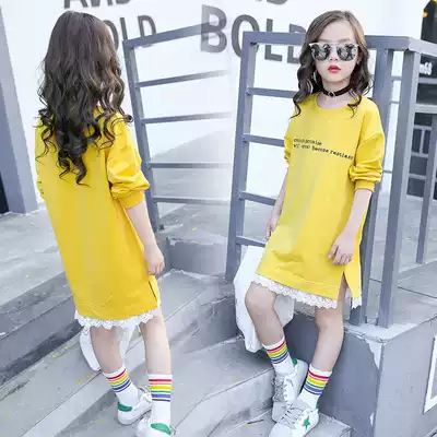 Girls in the long version of the sweater 2021 Spring and Autumn new cotton long sleeve T-shirt middle child lace stitching coat tide