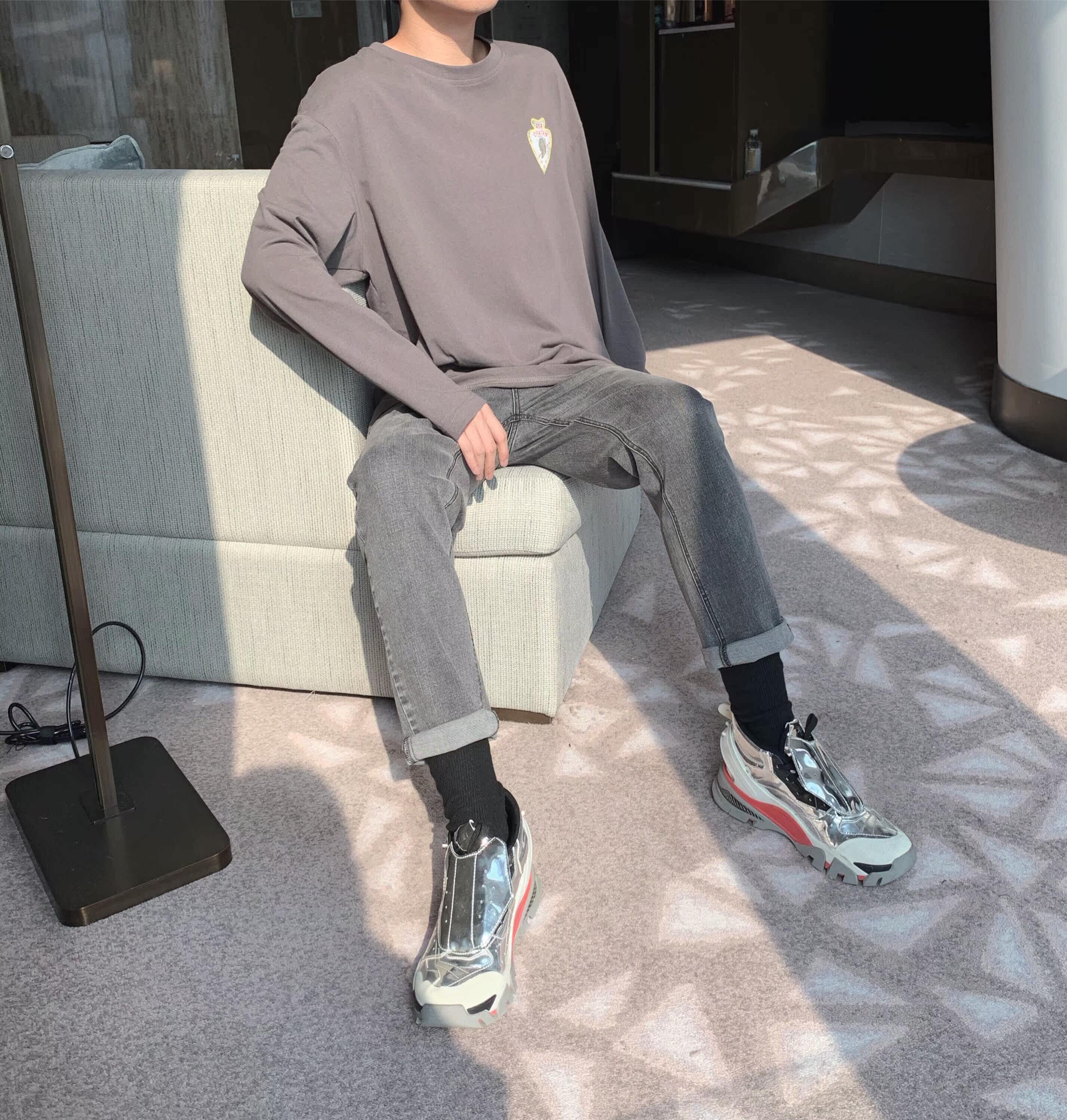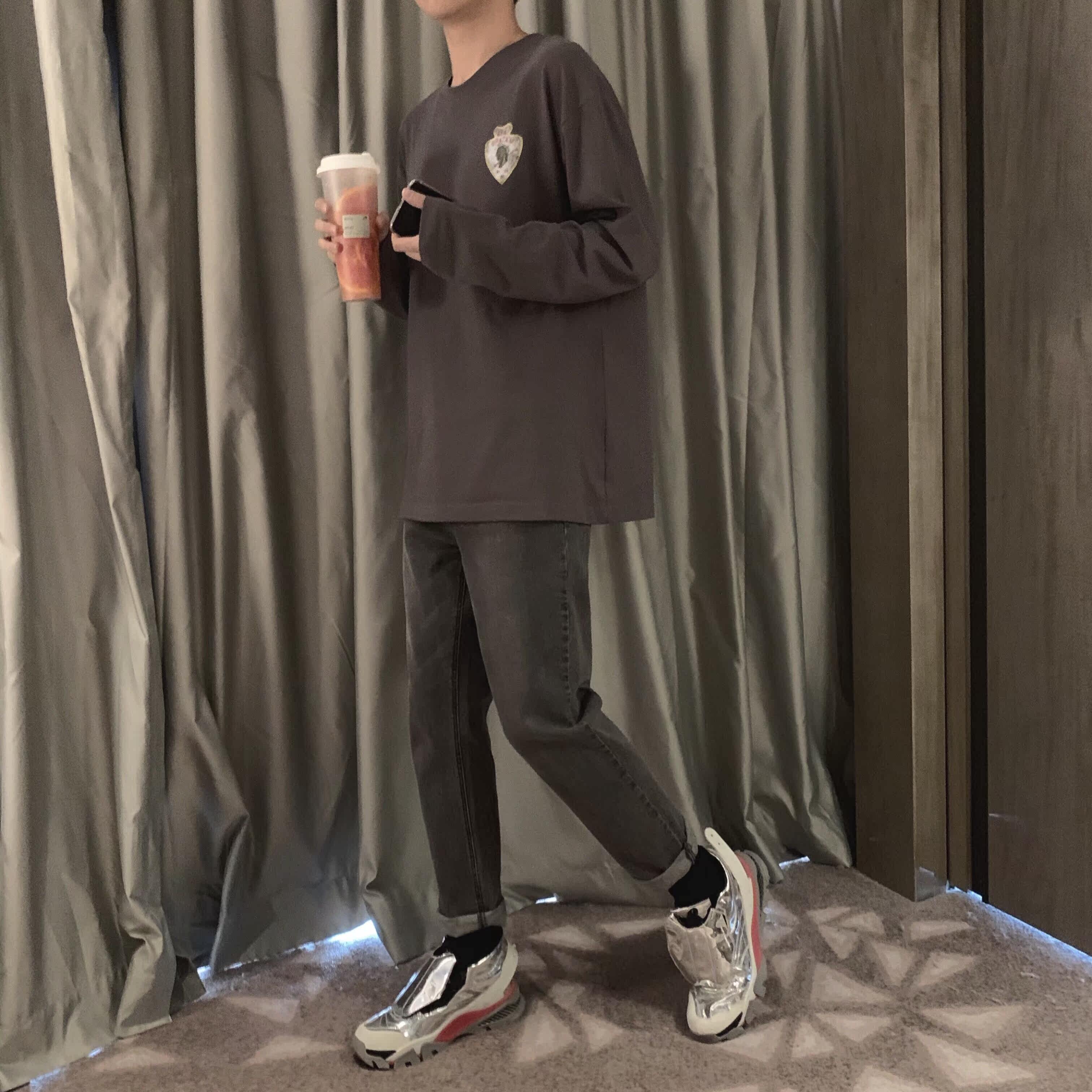 A tea and Agu autumn gray printed long-sleeved T-shirt men's Korean version loose and versatile bottom top