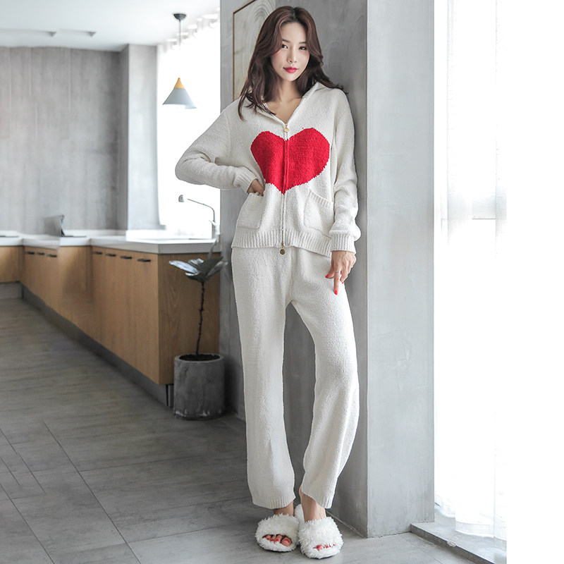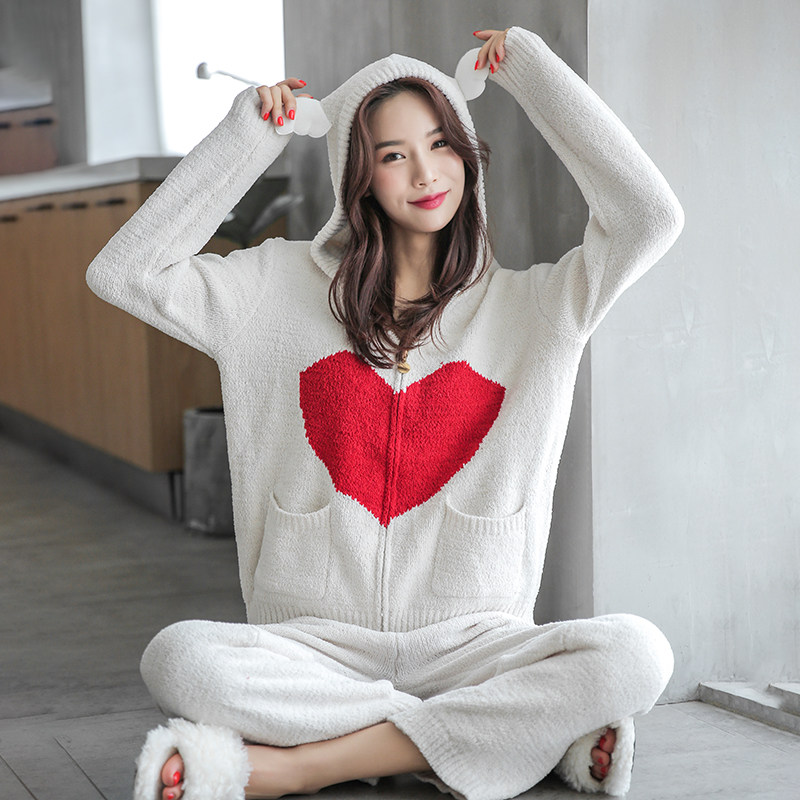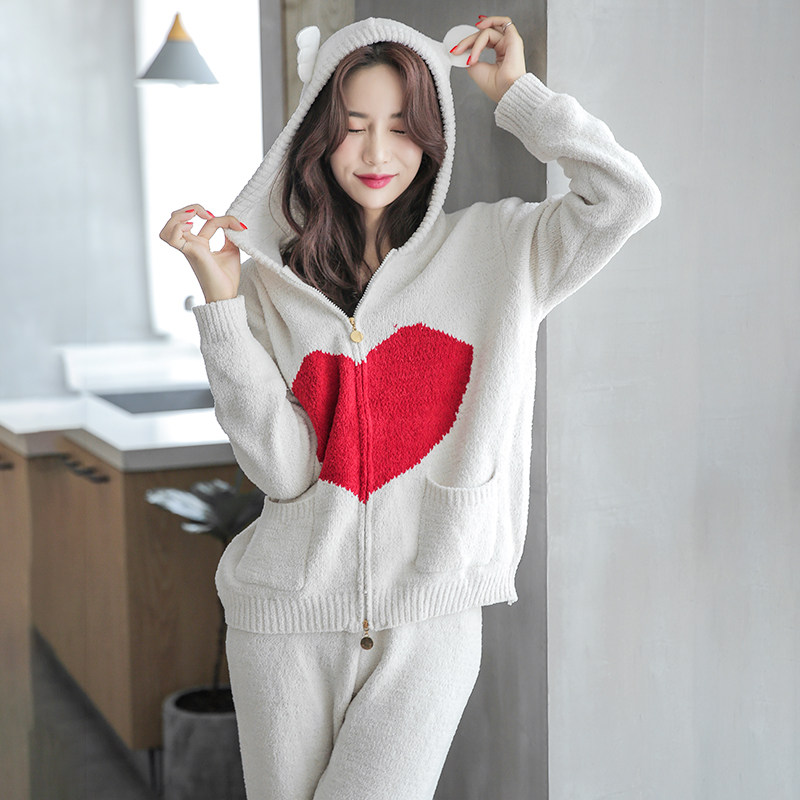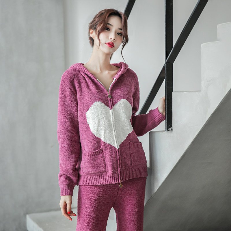 New soft sleeping women's autumn and winter knitted wool love hooded cardigan two-piece suit home clothes can be worn outside