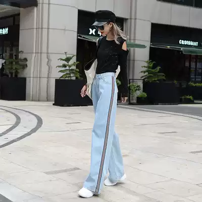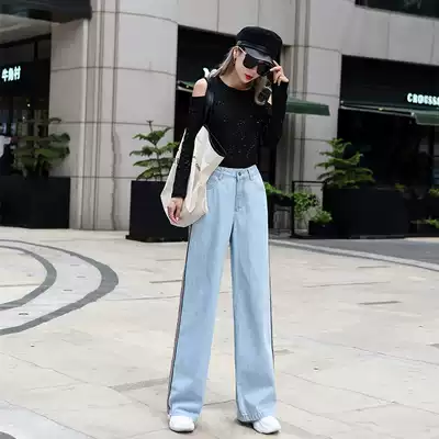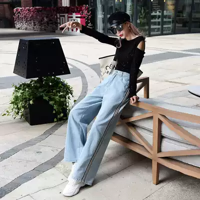 Wide-legged jeans women's autumn 2019 Korean version of high-waisted elegance with Hong Kong-style ribbon loose drape straight pants