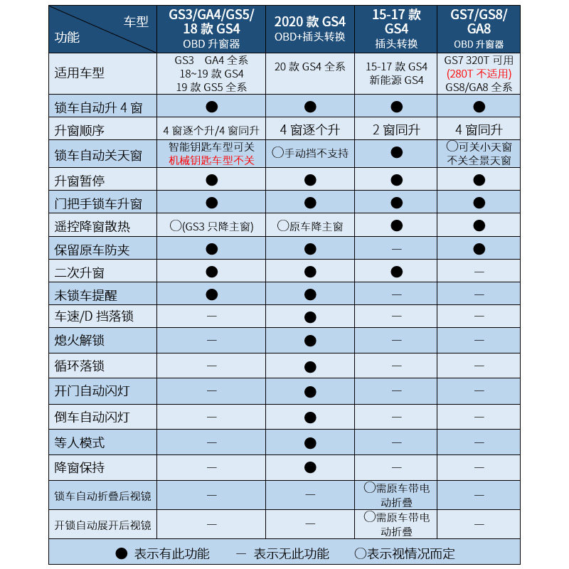 20 models of GS4 (up to 4 windows, sunroof, locked, flashing lights, unlocked door reminder) OBD with plug 18-19 models of GS4 all series (up to 4 windows, sunroof, unlocked door reminder) OBD