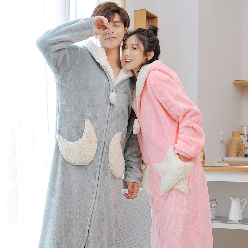 Sleeping gown women autumn and winter long version pregnant women bathrobe winter plus velvet padded nightgown couples flannel lazy pajamas men