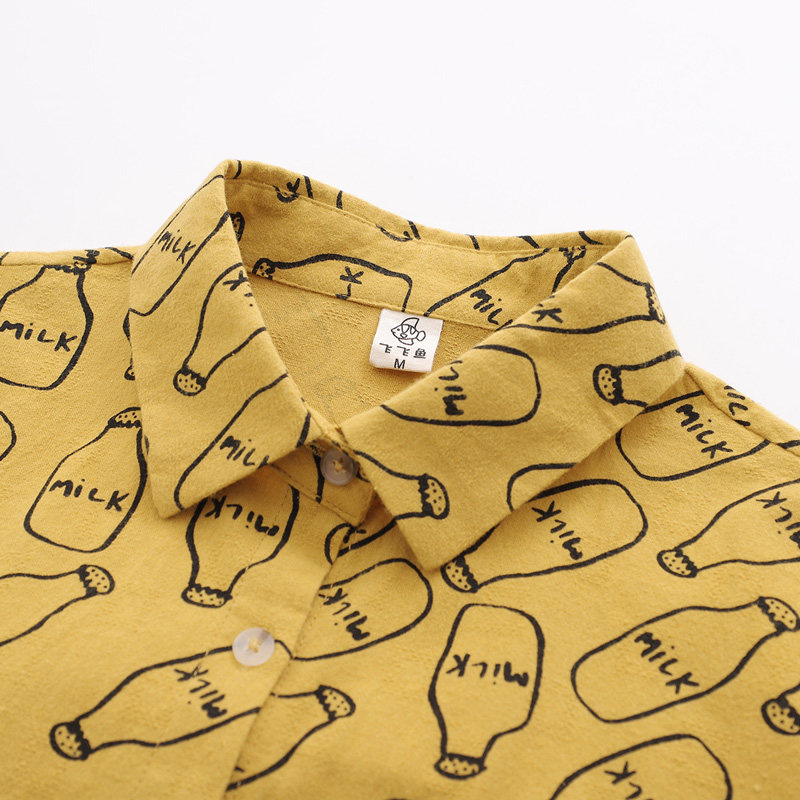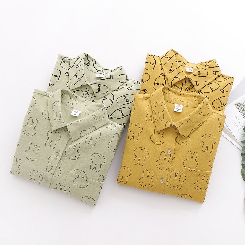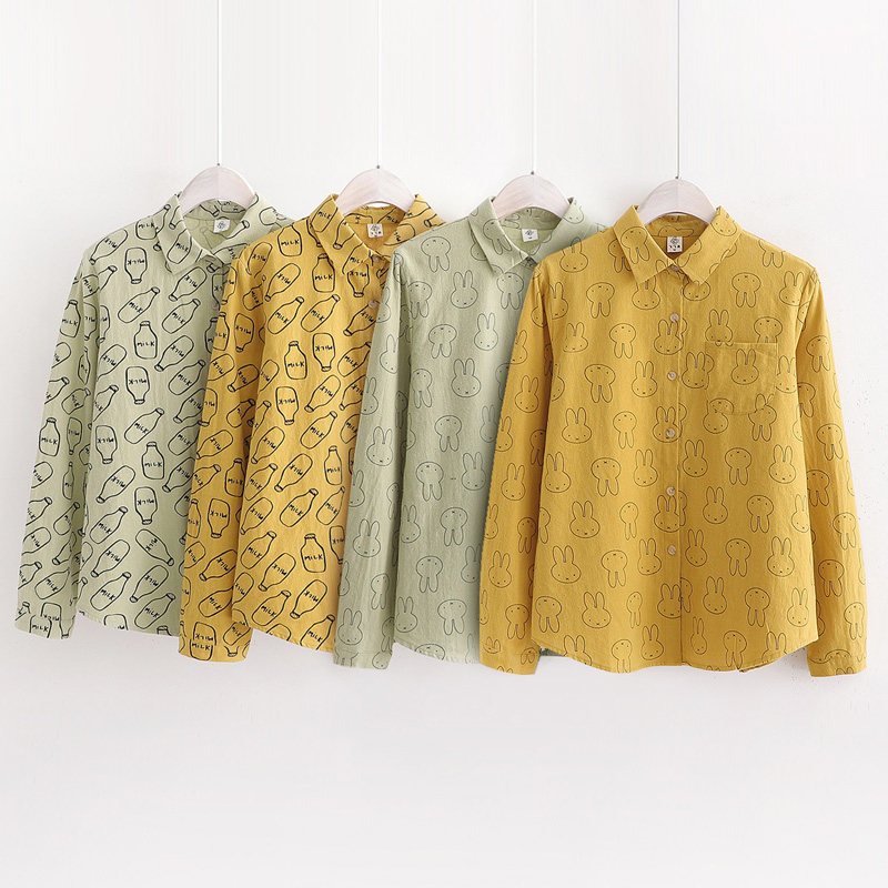 Autumn Clothing New College Rabbit Milk Bottle Printed Shirt Woman Fresh Pure Cotton Loose Long Sleeve Student Casual Shirt