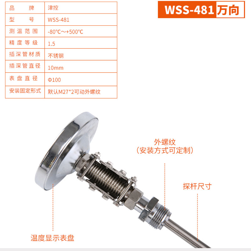 Jinkong universal bimetal thermometer wss-481 stainless steel industrial boiler pointer thermometer